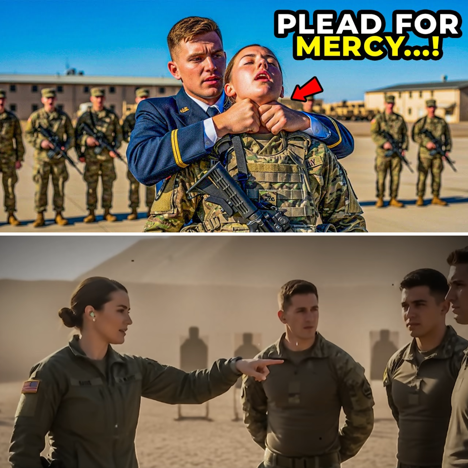 The Arizona sun is merciless, baking the tarmac at Fort Wuka until the air shimmers and the concrete radiates heat like an open oven. Staff Sergeant Kira Dalton stands at the edge of the main training yard, her boots planted, her expression unreadable. She’s 27 years old, just 5’6″, and dressed in standard OCPs—no ribbons, no insignia, nothing to hint at the kind of war stories that would silence every swaggering mouth on the base. Three male cadets circle her like sharks, their grins slick with cheap confidence, their eyes scanning for weakness and finding none. “You don’t belong here. Maybe try the nurse’s station,” one sneers, tossing the words like a grenade meant to wound. But Kira doesn’t flinch. She’s been here before—on worse ground, under heavier fire, in moments where arrogance got men killed and silence saved lives.