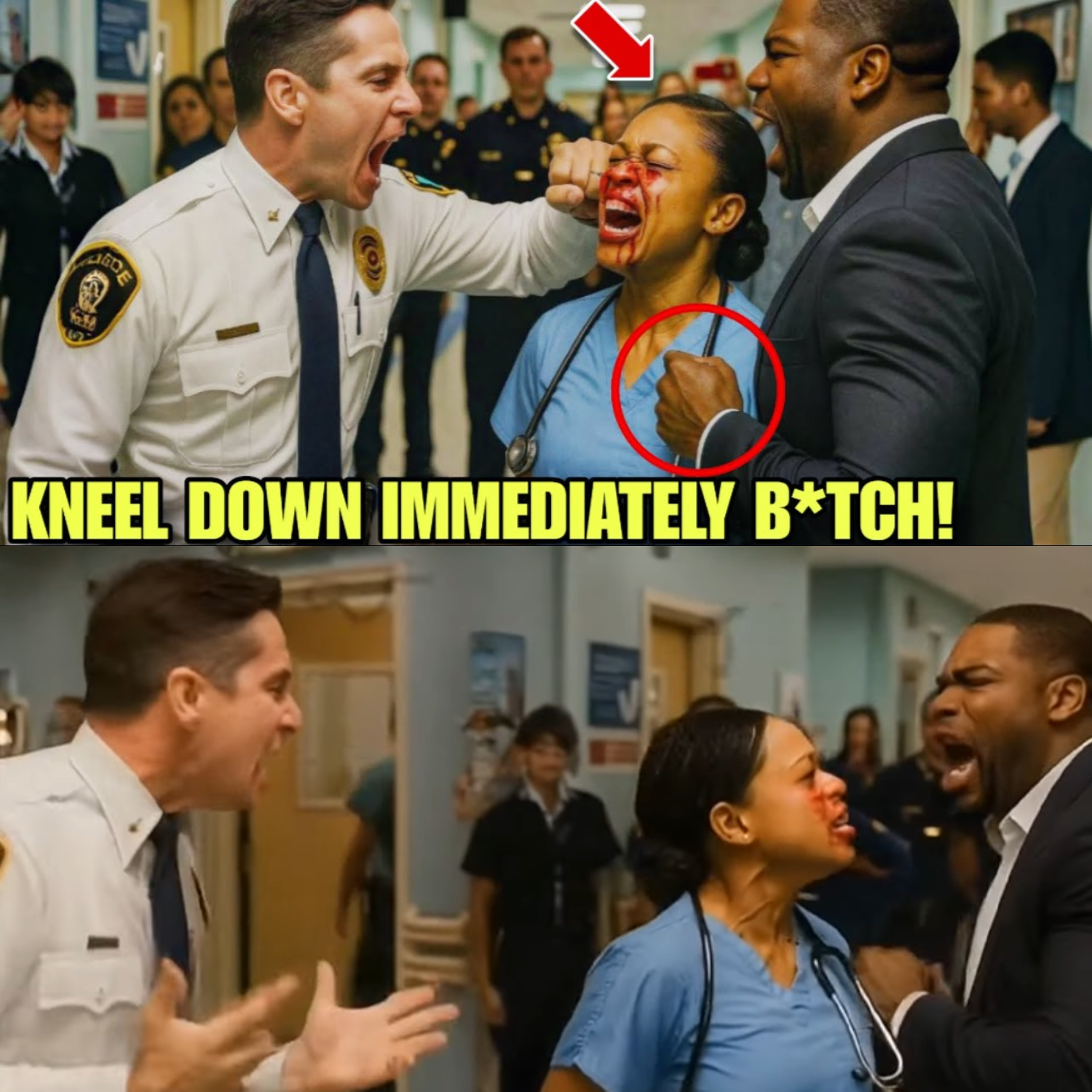 She turned and found herself face-to-face with Officer Victor Thorne, a white cop whose hand hovered near his holster. “Sir, I’m a nurse,” Ammani tried to explain, holding up her hospital ID. “This woman fell—” “Don’t move!” Thorne barked, eyes narrowed. Ammani raised her hands, one still clutching her phone. “Drop it!” “It’s my phone,” she stammered, confusion and fear colliding. Thorne lunged, knocking the phone from her grasp. It shattered against the concrete, a symbol of the fragility of safety in America.