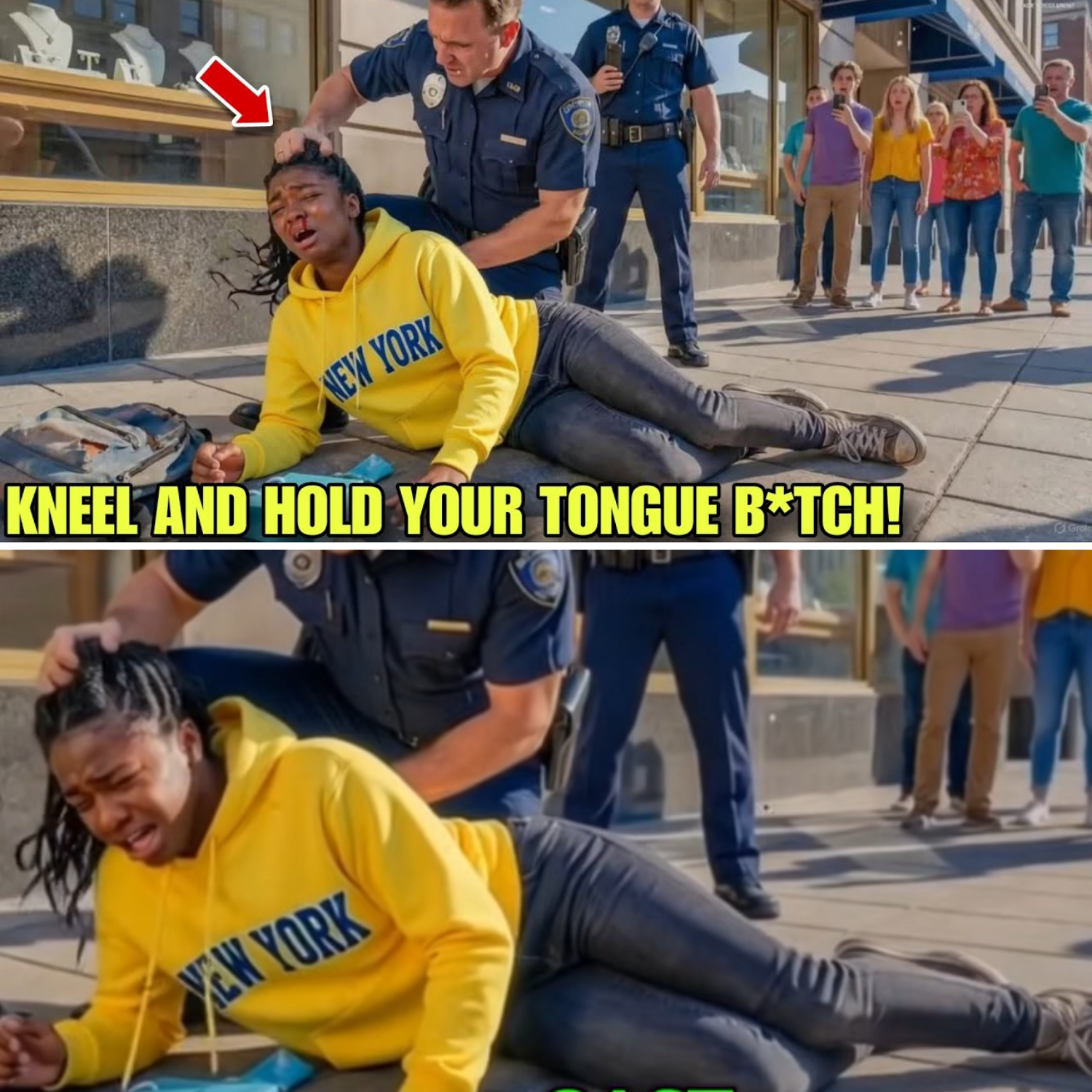 Officer Derek Miller stood over a young girl sprawled on the cold concrete. Her hands pressed against the pavement, trembling. Blood dripped steadily from her nose, dark red drops staining the sidewalk. A blue shopping bag from a high-end boutique lay nearby, its silver tissue paper scattered. “Shut your mouth, you little thug,” Miller snarled, his voice carrying across the street. “People like you don’t belong in this neighborhood. You thought you could just walk out of there.”