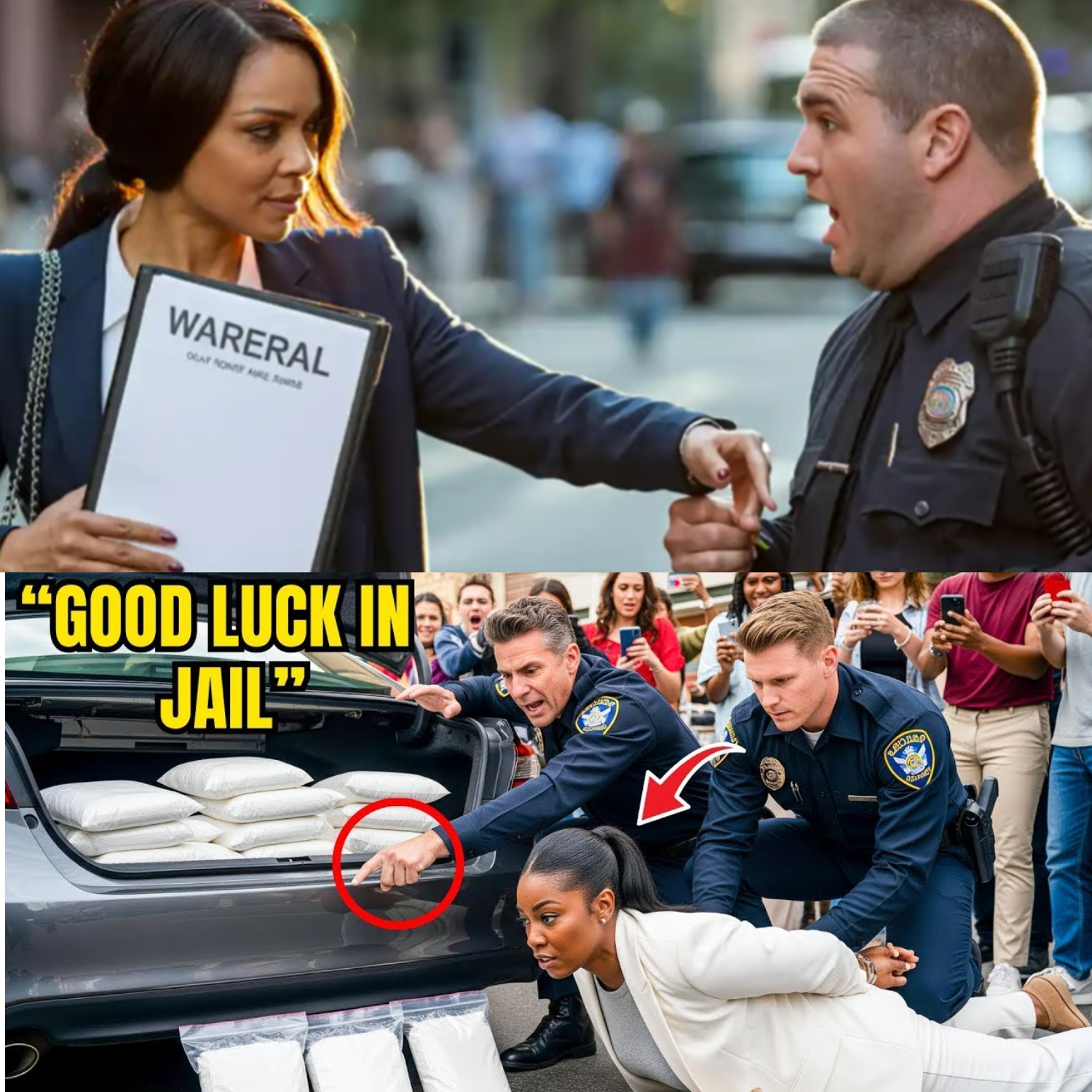 Without hesitation, Monica coldly pulled out a leather folder, her voice steady and commanding. “Officer, before you try framing me, maybe you should read this.” She opened the folder to reveal a bright blue federal warrant, emblazoned boldly with Officer Jackson’s name. The smirk vanished from his face as the weight of the moment hit him—this cop, who thought he was untouchable, was about to be exposed by the very woman he tried to trap.