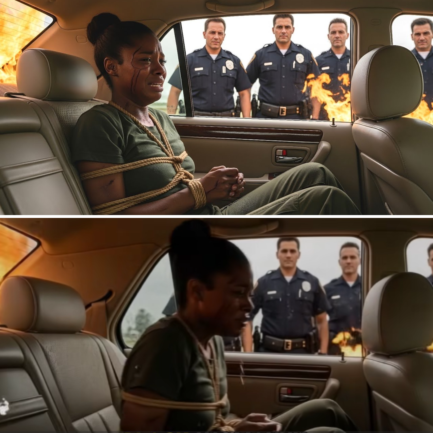 Outside, the officers laughed as they splashed gasoline around the car, the scent of fuel mingling with betrayal. Maya’s mind flashed back to her days of training—discipline, patience, the art of survival. She remembered the knots: square, slip, sailor’s hitch. The officer had tied it wrong, overconfident and sloppy. She twisted her wrists, ignoring the burn, dislocated her thumb with a painful crack, but freed one hand. Flames erupted at the edges, small at first, then roaring, devouring oxygen, licking the doors and windows with violent hunger.