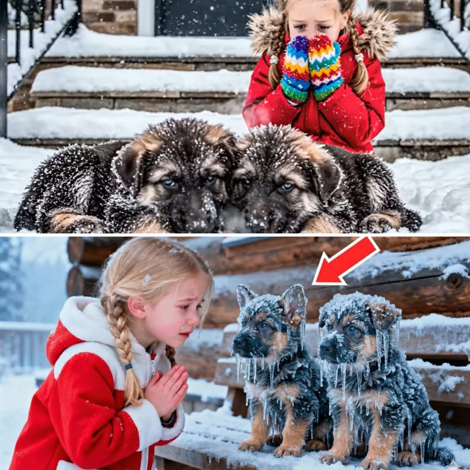 She ran to the front door, cracked it open, and her heart nearly stopped. Two German Shepherd puppies, shivering and covered in ice, huddled together on the porch steps. Their little bodies barely moved, frozen by the storm and fear. “Mom! Dad!” Lily called, but the storm swallowed her voice. She didn’t hesitate. She rushed outside, scooped the trembling puppies into her arms, and dragged them inside, kicking the door shut behind her.
