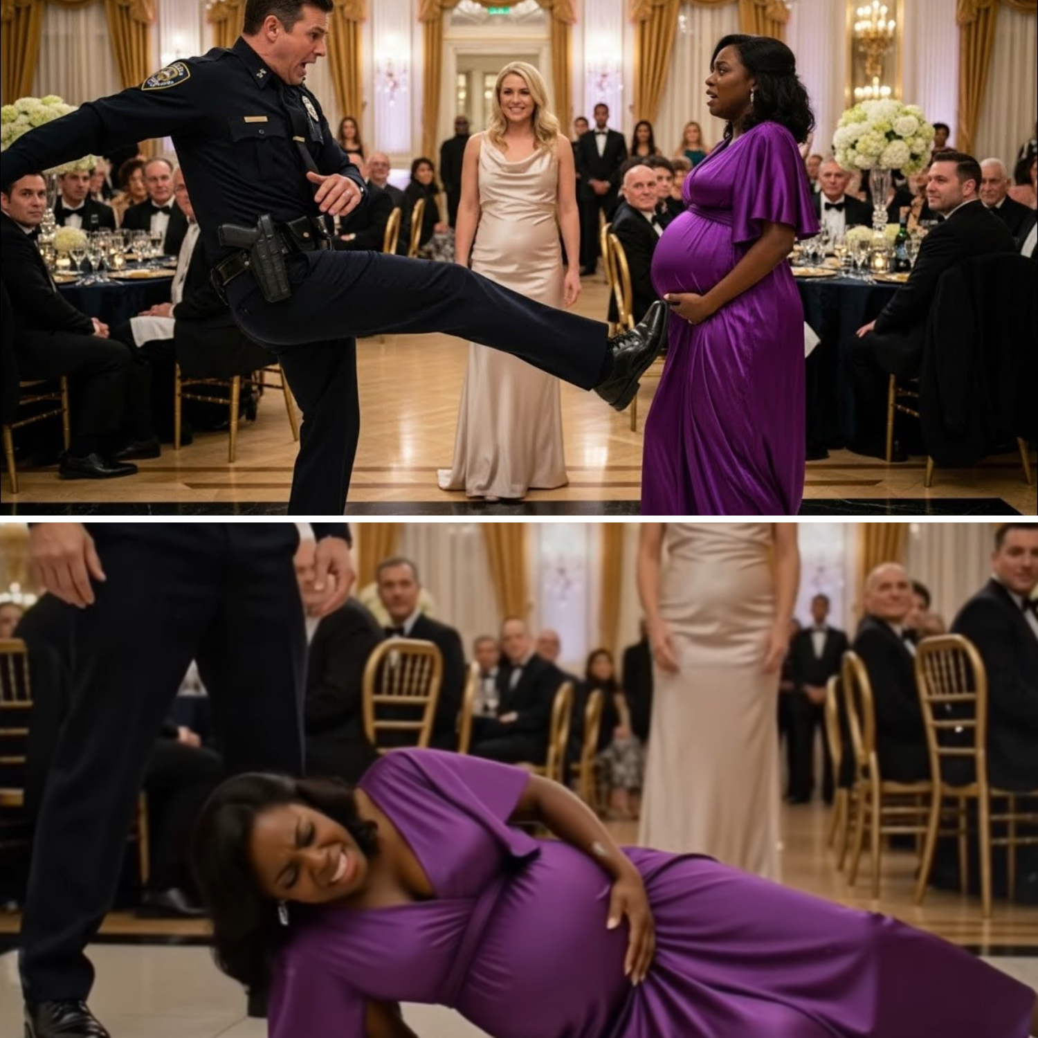 The ballroom glittered with crystal and gold, the air thick with music and the quiet hum of privilege. Amara moved with care, her hand resting protectively on her belly. She had come to celebrate, to represent her family with pride. But across the room, a blonde woman—Chelsea Hawthorne—watched her with an unsettling smile, feeding the tension she herself had stirred. Officer Bradley Marsh burst in, eyes wild, convinced he’d found his suspect. He didn’t stop to ask questions. He didn’t see Amara’s humanity. He saw a headline.