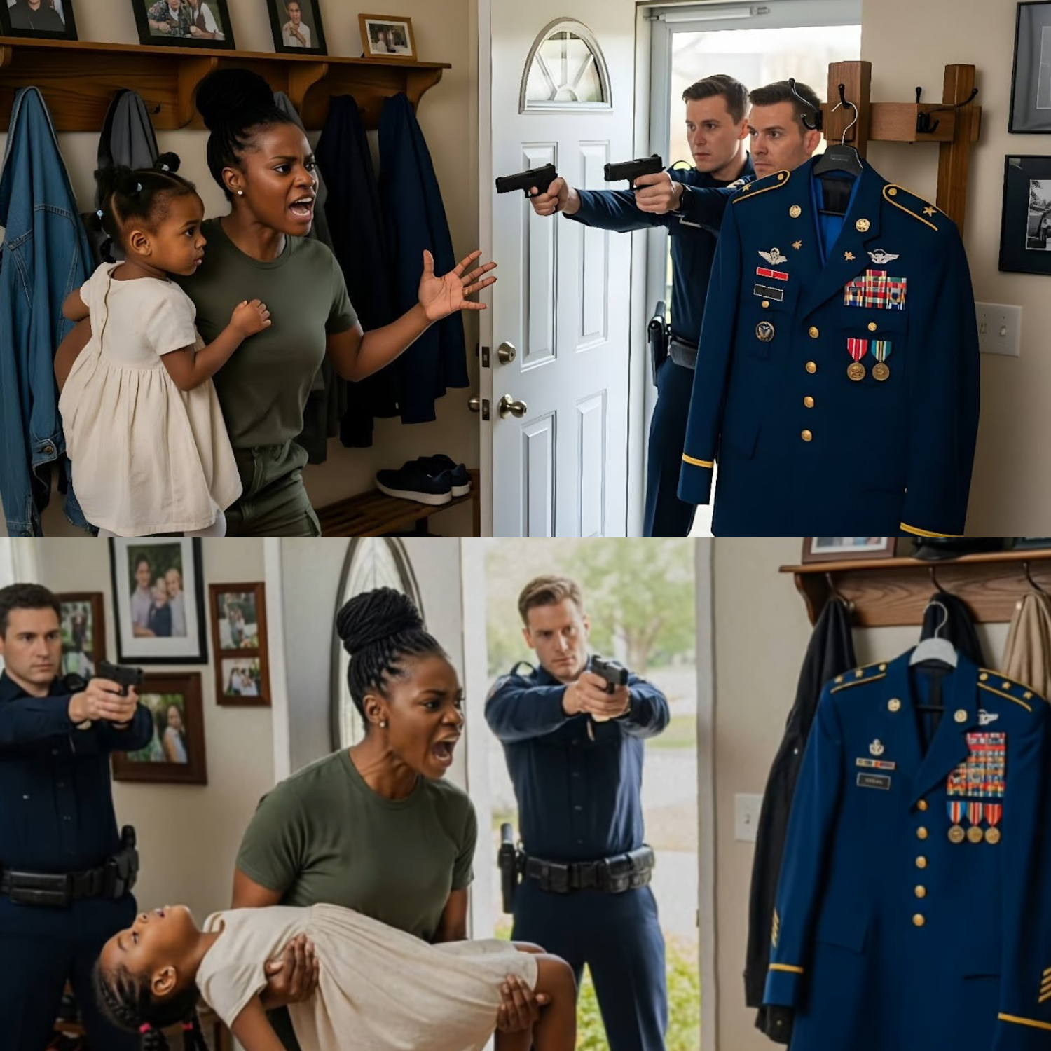 The officers hesitated, adrenaline surging, the situation teetering on the edge of disaster. Marsha’s pulse thundered as she tried to shield her daughter, her mind racing. The fear in the officers’ eyes told her reason had no place here. Outside, a storm raged, lightning illuminating the chaos like a grim spotlight. Then, fate intervened—a dropped flashlight’s red beam landed on a framed photograph hanging behind Marsha. It showed her in full military uniform, medals gleaming beneath the American flag, a salute symbolizing honor and sacrifice.
