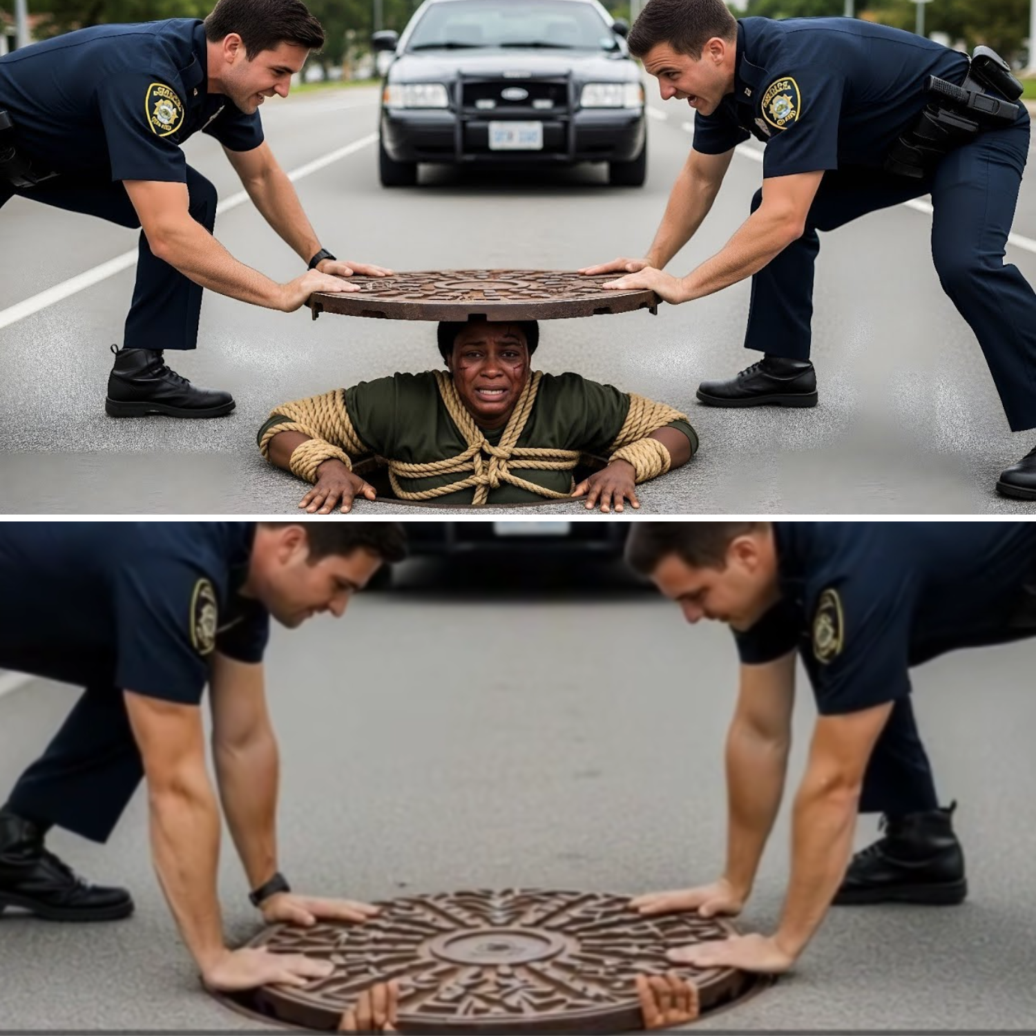 From the moment the sun crested over a silent American street, its golden rays fell on a scene so grotesque it could have been ripped from a dystopian nightmare. Two police officers—faces twisted with smug authority—dragged a bound black woman toward an open manhole in the middle of the road. Her wrists and arms were lashed with industrial rope, biting into her flesh as she fought for every inch of dignity left. The officers, drunk on their own power, laughed like cartoon villains, shoving her knees onto the metal ring that framed the abyss below. The flashing red and blue lights painted her face in a macabre glow, illuminating the dried blood on her cheek, the dirt smeared across her torn uniform, and the raw terror in her eyes. But beneath that terror flickered something they could never comprehend—a steel resolve, forged in battle and sharpened by survival.