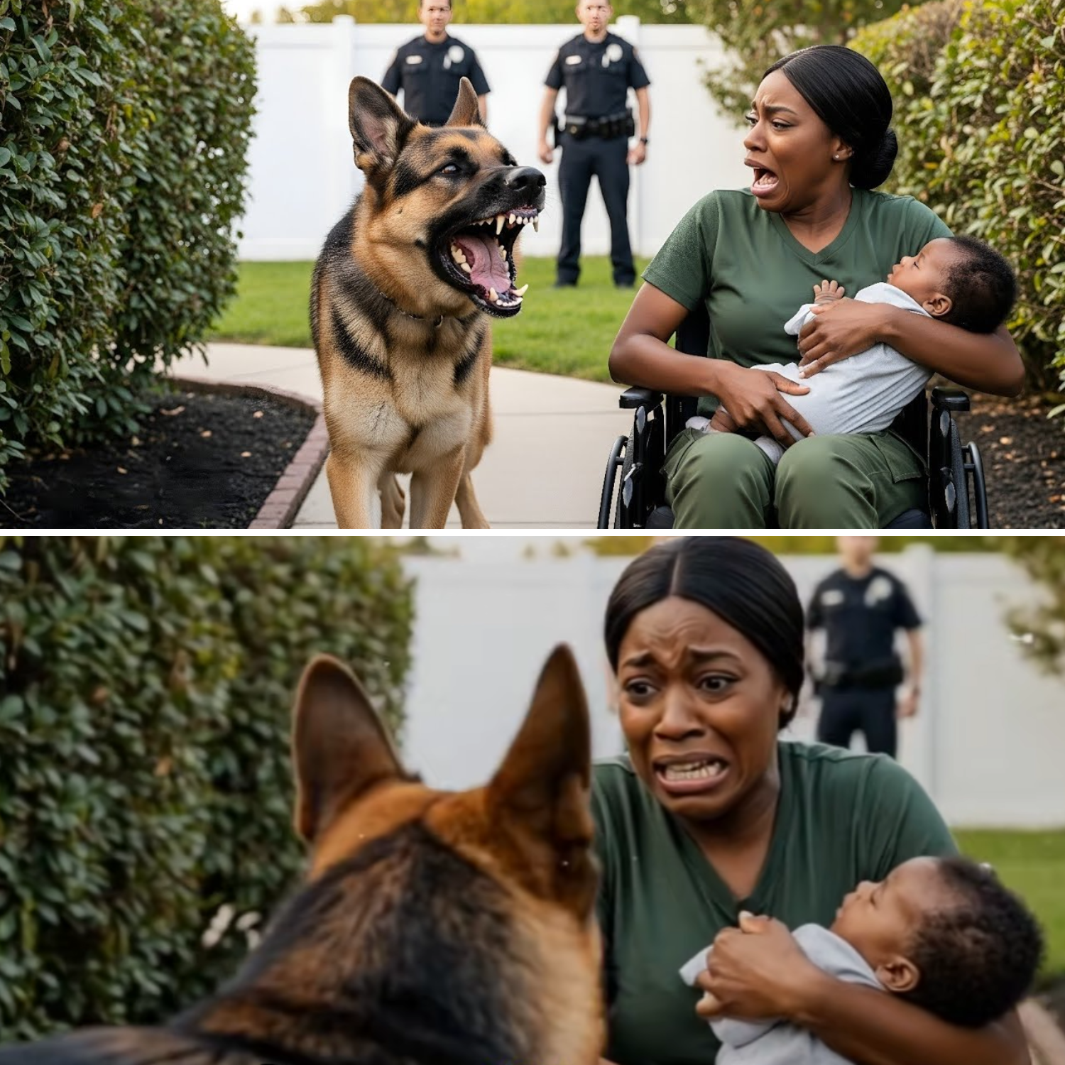 The air froze as the snarling German Shepherd lunged, teeth glinting inches from her trembling face, while two officers stood behind with blank eyes of authority, shouting commands they didn’t understand the weight of. The baby’s cry pierced the silence, and fear twisted into something deeper—memory, instinct, power. They thought she was helpless in that wheelchair, just another woman to intimidate. But they didn’t know who she really was. Not just a survivor, but a soldier. A handler. The one who trained dogs fiercer than any of theirs. As the beast’s eyes met hers, something ancient stirred—a command only a true handler could give, one that would change everything.