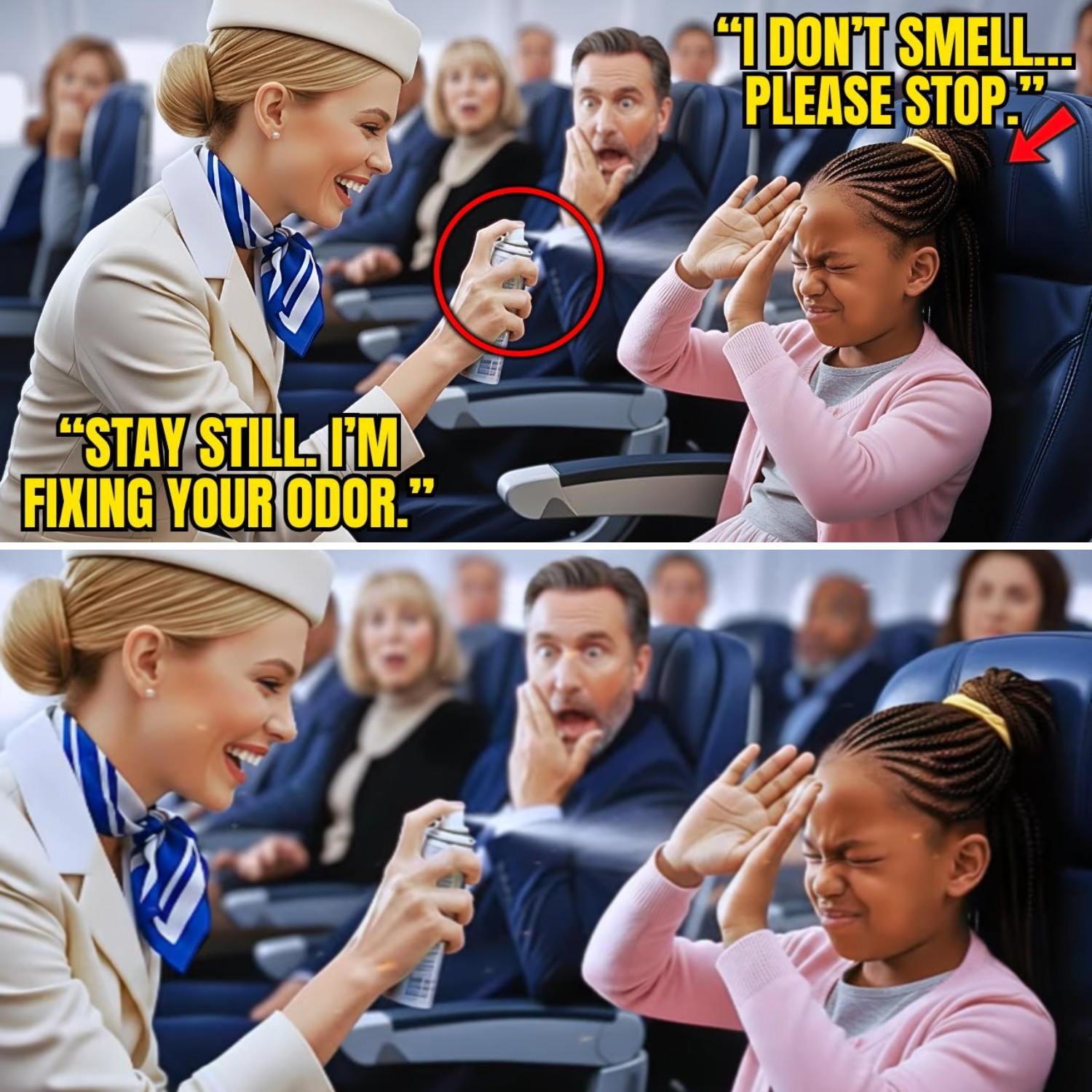 The moment the tension snapped, the cabin felt smaller than ever. Mara sat stiff in her seat, staring at the patterned carpet while the flight attendant hovered above her, one hand gripping the spray can, the other planted on her hip. Her voice sliced through the air like she owned the sky.