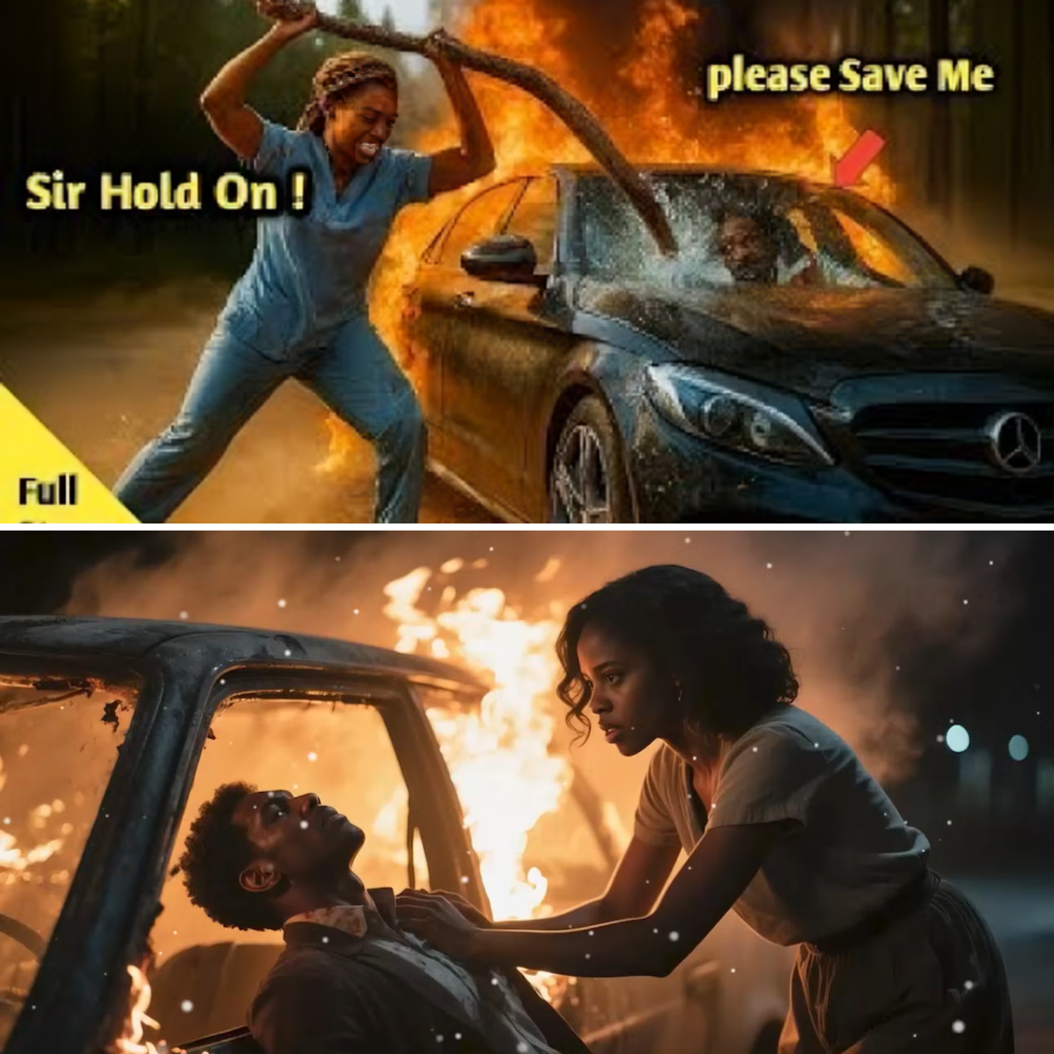 The car was a black luxury beast, now a twisted inferno. Through the cracked windshield, she saw him: a man slumped over the wheel, blood painting his face, his suit—tailored, expensive—already singed at the cuffs. The air was thick with gasoline and terror. Naomi smashed the window with her elbow, glass slicing her skin, and fumbled with the seatbelt that refused to give. Only adrenaline and her EMT knife set him free. His body, heavy and limp, dragged across the pavement just as the car exploded behind them. The blast threw sparks into the night, but Naomi shielded him with her own body, feeling the heat sear her back.