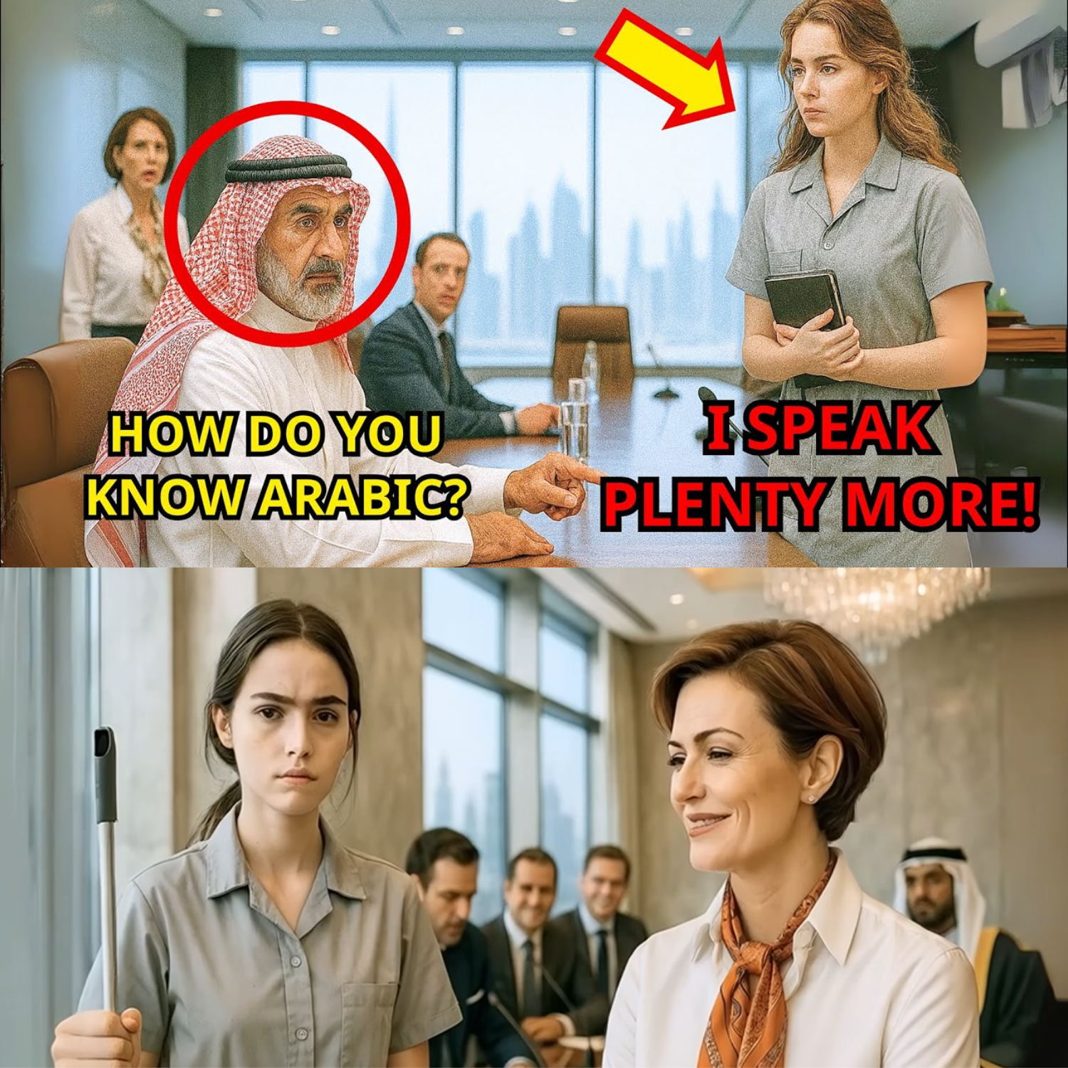 That’s when Madison Carter, the hotel maid mopping quietly near the wall, lifted her head and responded in flawless Gulf Arabic. The entire room froze. Zade stopped midstride, turned, and looked at her as if he’d just heard a voice from the royal court itself. Madison, 26, with long black hair tied in a neat ponytail, wore her crisp uniform without a hint of makeup. Her eyes were steady, sharp—she didn’t beg for attention, but when she spoke, her voice carried a quiet weight that made even billionaires listen. “Forgive them, your excellency,” she said. “They meant to assure fair partnership, not demand upfront payment.” Her accent was perfect, the kind you get from living in Oman for eight years, not from a textbook.