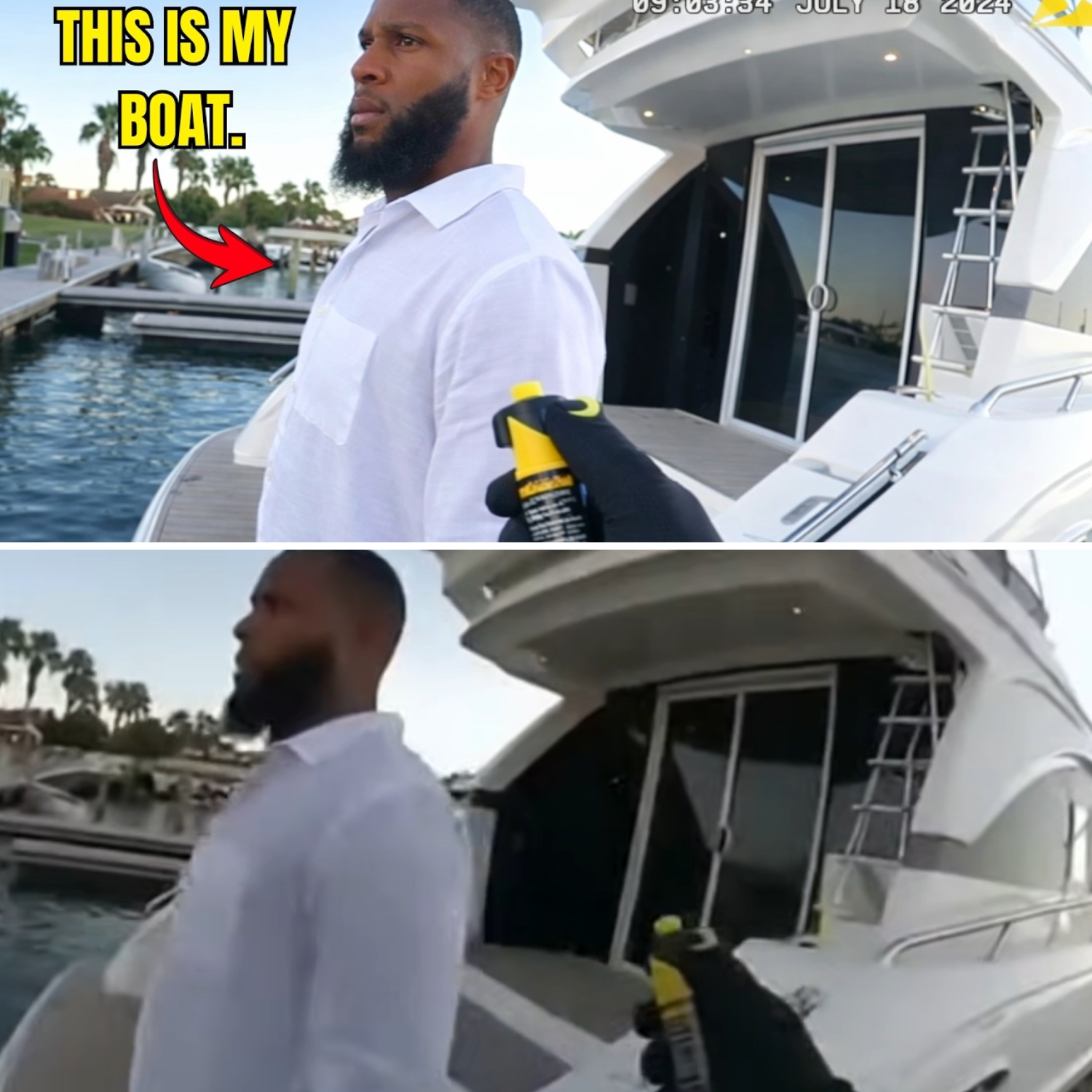 The command came sharp, loud, and dripping with authority: step off the boat, now. Get on your knees or you will be sprayed. It sliced through the quiet Florida marina like a siren in a church. But the man standing on the polished teak deck didn’t flinch.