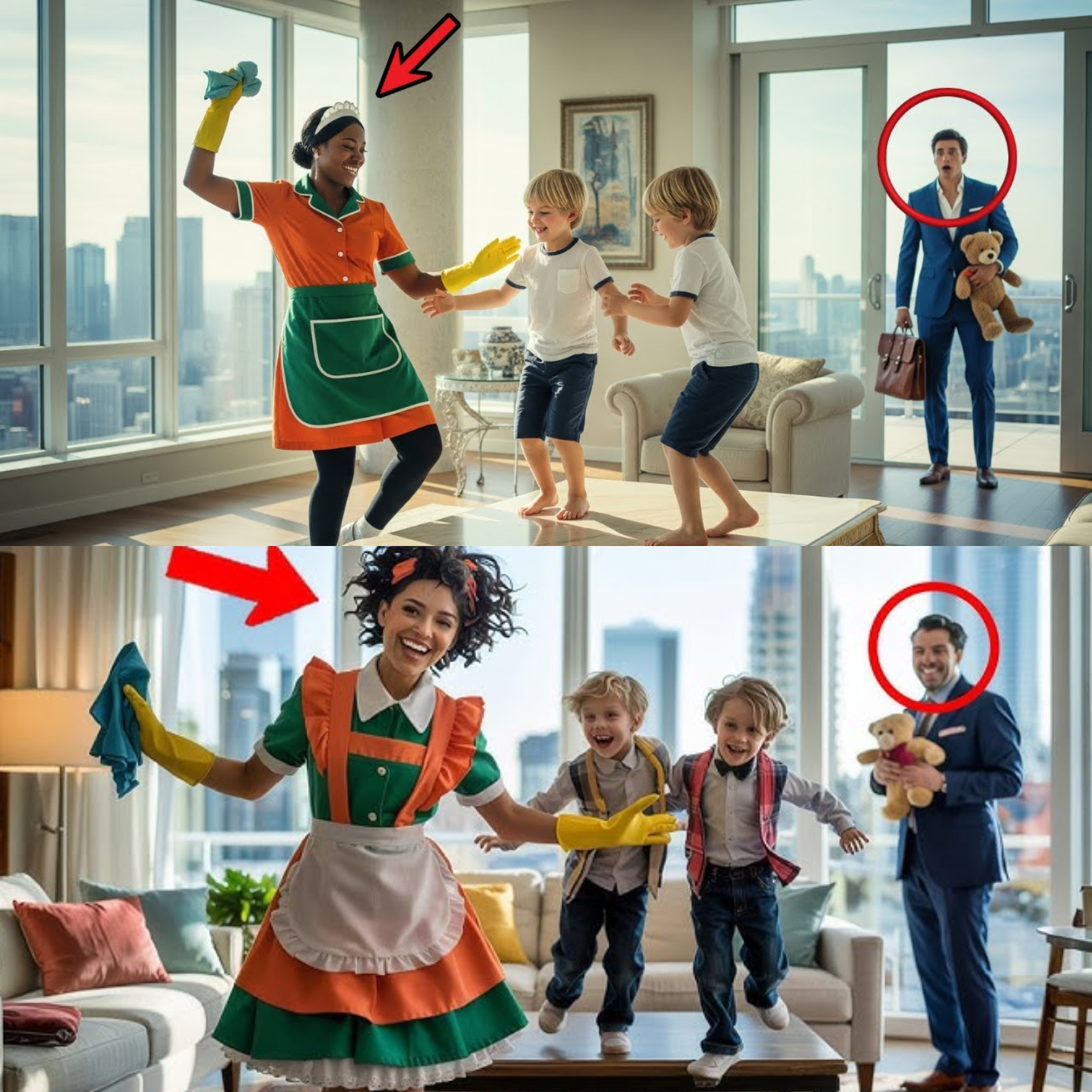 One evening, he returned home earlier than expected. From the hall, he heard music thumping faintly. He followed the sound and froze at the doorway of the kitchen. Naomi stood behind the boys, supporting them gently under their arms. Jacob and Caleb were upright, standing, pressed against the wide marble island, their small legs trembling but determined. “Find the ground with your heels,” Naomi whispered. “Breathe. Feel your strength.” Samuel’s heart slammed against his ribs. The medical reports had been merciless: independent standing was impossible. And yet here they were, shaky but on their feet. “Papa!” Jacob gasped, spotting him in the doorway, his face glowing with pride. “Look, we’re standing!” Samuel staggered forward, his throat burning. For years he had prepared himself to accept wheelchairs as permanent. But in that moment, staring at his sons’ fragile yet defiant triumph, he felt the ground shift beneath him. And for the first time in years, he dared to believe.