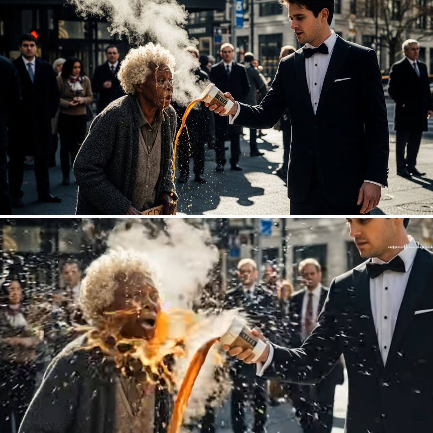 Mia slowly wiped the coffee from her face with the sleeve of her tattered jacket. Her hands were shaking, not from fear, but from something deeper, something broken. She’d been standing on this corner for three months, ever since the hospital bills had swallowed her savings and the landlord had changed the locks. Sixty-two years old, a former elementary school teacher, now invisible to everyone who rushed past with their expensive phones and their important meetings.