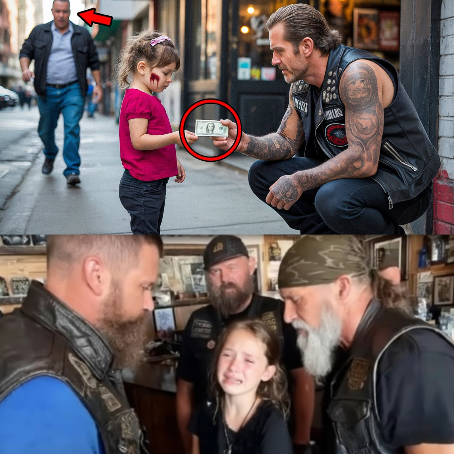 Inside, the bikers stared in disbelief. Hammer, the president, was the first to move. His presence filled the room—a living wall of muscle, tattoos, and scars. But Emma didn’t flinch. She explained everything: her mother’s illness, her uncle’s ultimatum, her $5. The bikers listened, their faces darkening at every detail. They saw the bruise on her arm, the fear in her eyes. They understood more than she could know.