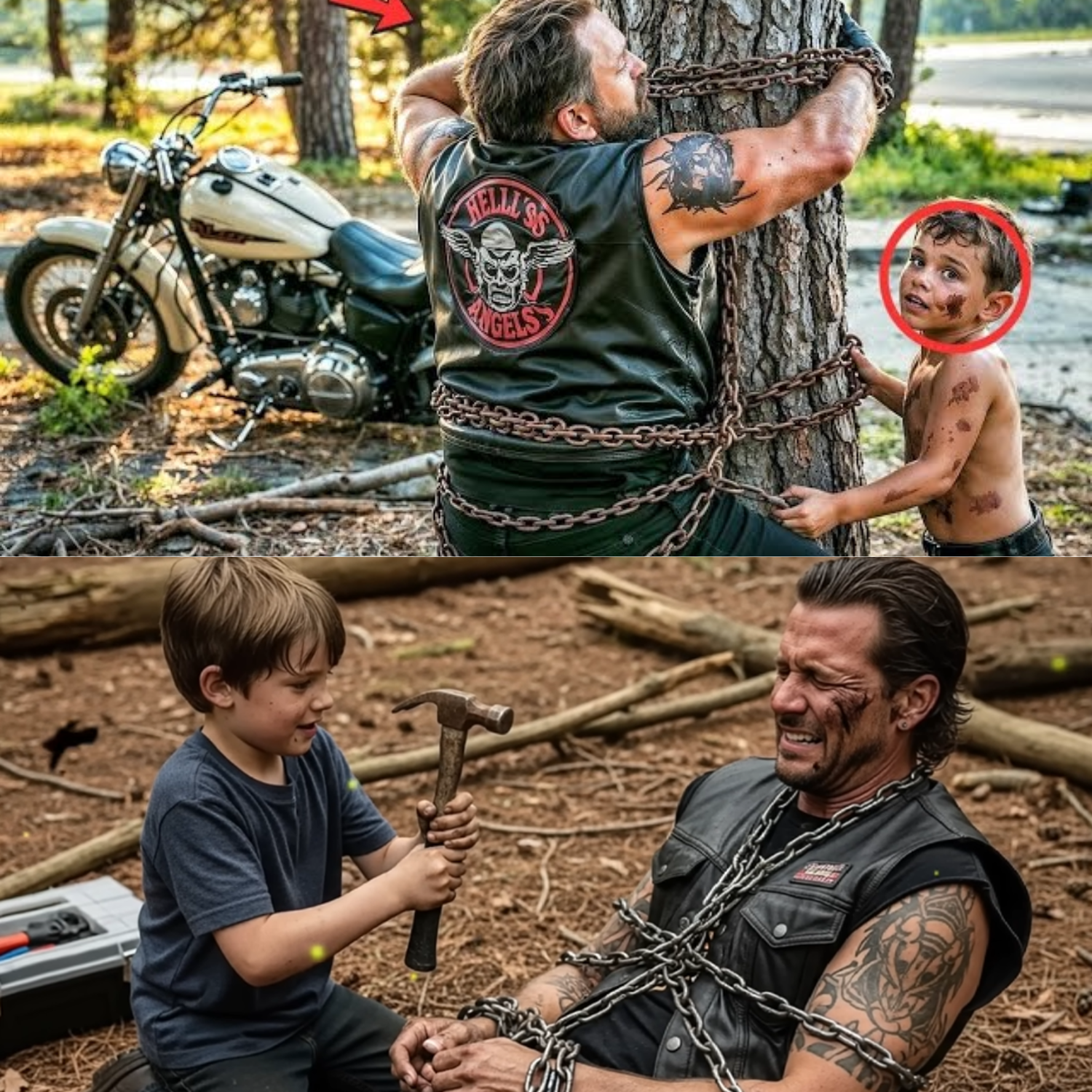 Eli was seven years old—barefoot, wild-haired, and stained with the kind of grime that clings to skin after a day spent dodging heartbreak. He lived nearby in a battered trailer, the kind of place people drive past without looking, with a mother who worked herself to the bone at the local diner. That day, Eli had wandered deeper into the woods than ever before, chasing a frog, chasing curiosity, maybe chasing a little peace from the shouting and slammed doors that haunted his home. As the sun bled into the horizon, Eli stumbled through the underbrush and stopped dead. There, chained to an old pine tree, was a sight that would have sent any sensible adult running for the sheriff—a man, massive, covered in tattoos, slumped in a black leather vest emblazoned with a blood-red skull and wings. “Hell’s Angels,” the patch screamed. His head hung low, his breathing ragged. Nearby, a motorcycle glimmered in the dying light, dusty but defiant.