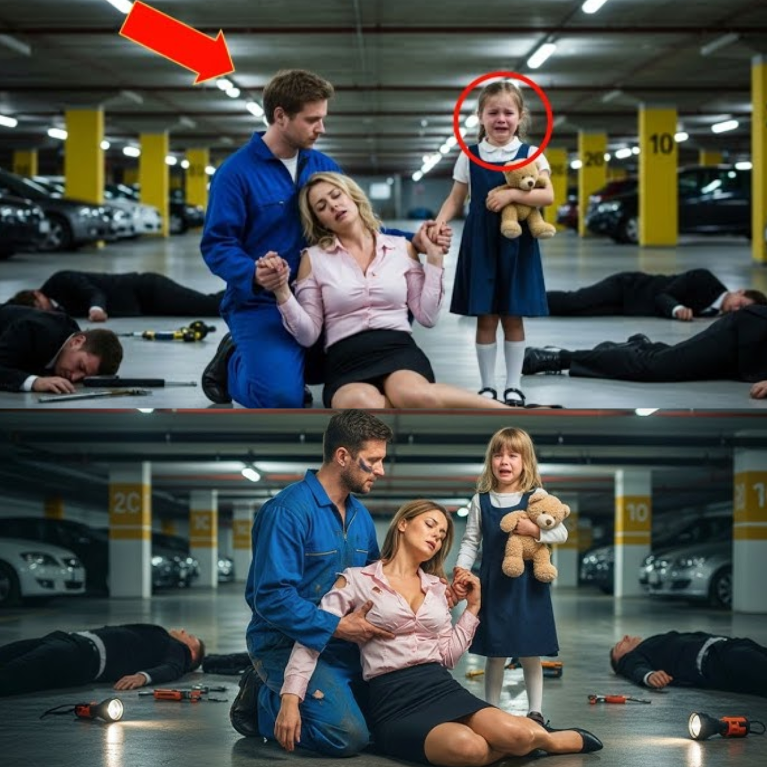 The men turned, sneering at the grease-stained mechanic who dared to intervene. “Who the hell are you?” one spat. Jake’s answer was swift and brutal—a flurry of fists and knees, a stolen metal pipe swung back against its wielder. Within moments, the attackers lay defeated, and the woman, Elena, was safe. Her tears mingled with rain as she embraced her daughter, who ran to her shouting, “Mommy!”