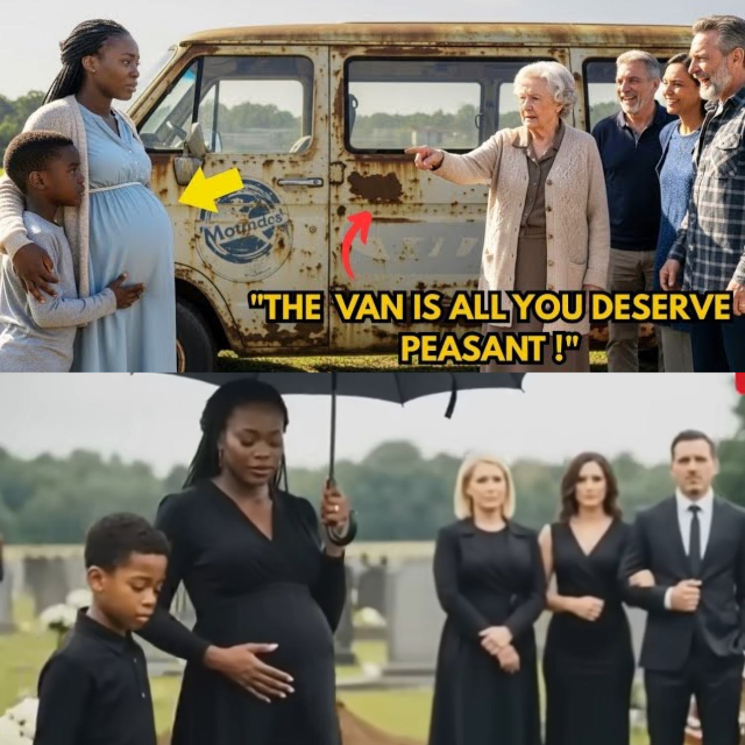 But the real cruelty came after the last shovelful of dirt. In the lawyer’s office, Naomi sat quietly as her late husband’s will was read: the house, the business, and the ancient 1972 van. Relief flooded her—he’d protected her, even now. But then came the venom. Her father-in-law leaned forward, voice cold and clipped: “The house and business are family property. You married into it. You don’t own it. The only thing you get is the van. Frankly, you’re lucky we’re letting you have that.” His daughter snickered, exchanging a look with her brother. “Enjoy your inheritance, Naomi.” The lawyer tried to object, but the in-laws shut him down, daring Naomi to fight. “Take us to court. Let’s see how far you get—pregnant, broke, and homeless.” They threw her out, their laughter echoing as she walked into the drizzle with nothing but a set of van keys and her son’s small hand in hers.