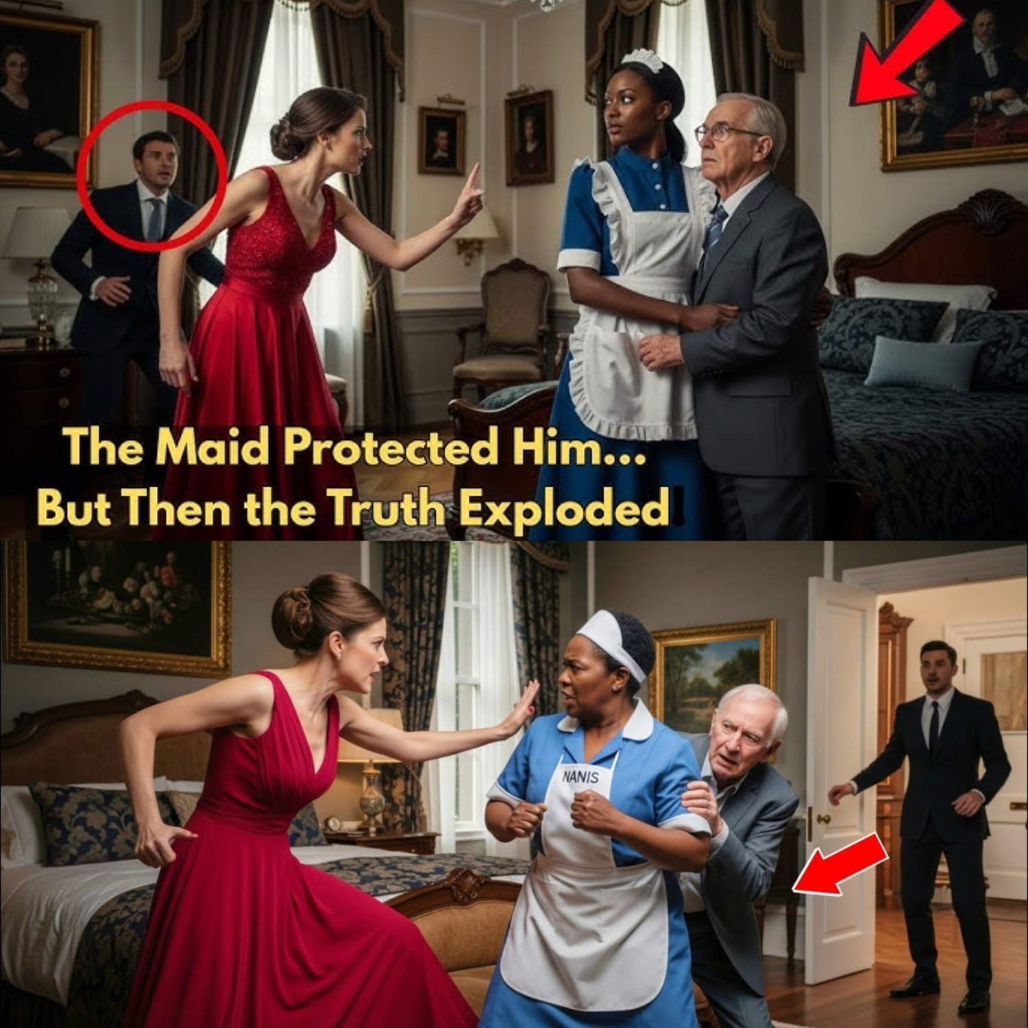 The breaking point came on a thunderous Thursday evening. Arthur was resting in his bedroom. Clara carried him tea, humming softly, when she heard muffled noises behind the door. Her stomach dropped. She pushed the door open a crack—and what she saw nearly made her scream. Isabella was leaning over Arthur’s bed, pressing a pillow down over his face. Arthur’s arms flailed weakly, legs kicking, but his frail body had no strength to fight her off. Clara dropped the tray, tea spilling across the floor, and shouted, “Stop!” Isabella jerked back, eyes wide with fury. “You stupid girl! You don’t know what you saw!” Clara rushed to Arthur, pulling the pillow away. He gasped desperately for air, clutching her hand. “She… she tried to kill me.”