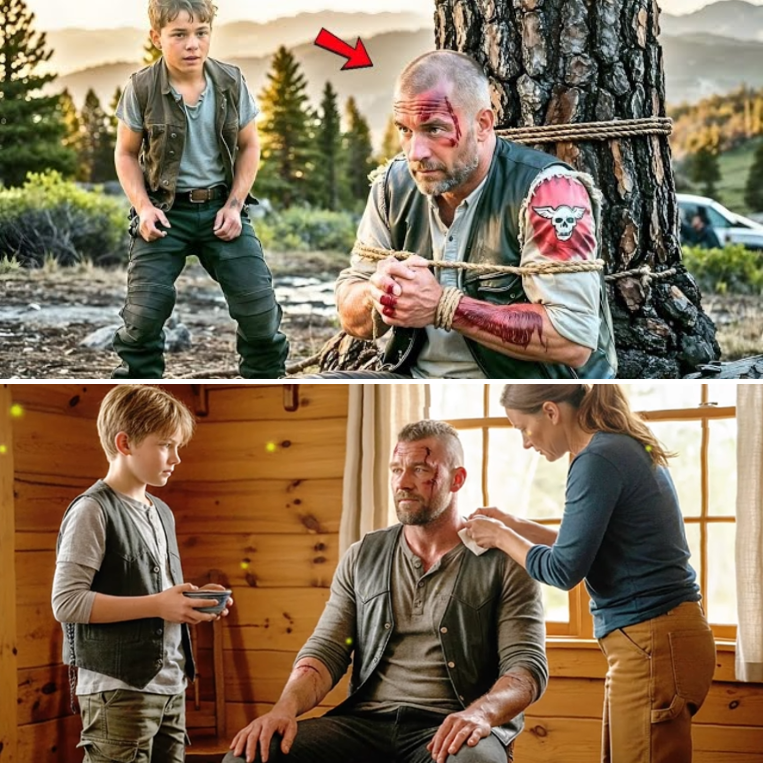 Eli had been warned about trouble. His mother, a woman hardened by mountain winters and the kind of loneliness that makes your bones ache, always said that trouble finds the soft-hearted. Eli’s heart was softer than most—too soft, maybe, for a world that chews up the gentle and spits them out. He knew he should run. He knew he shouldn’t get involved. But he couldn’t look away from the biker, tied up like an animal, breathing in ragged gasps as if every inhale cost him a piece of his soul. Fear crawled up Eli’s spine, but something bigger—a wild, stupid instinct to help—rose inside him. He knelt, hands shaking, and studied the ropes cutting cruel lines into the man’s skin. He thought of how cold the nights could get, how the woods were full of hungry things, and how anyone left helpless here was as good as dead.