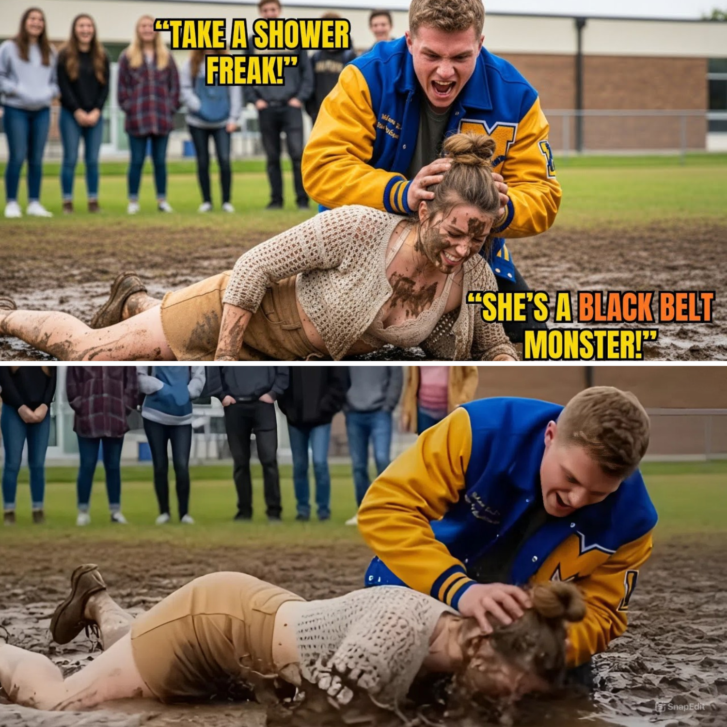 Anna moved—a blur. She didn’t throw a wild punch; she executed a technique. As Mark lunged, she sidestepped with fluid grace, her mud-slick body evading his grasp. Her left hand shot out, capturing his wrist. She twisted, using his momentum, pulling him off balance. It looked like a dance—a brutal, unforgiving dance. Mark grunted in pain, stumbling forward. Anna pivoted, her right leg a piston. She delivered a thunderous roundhouse kick to his thigh—a chudan mawashi geri, designed to destroy an opponent’s leg. Mark screamed, a high, pathetic sound, utterly alien from the school’s golden boy. His leg buckled, and he collapsed in the mud, clutching his thigh, face contorted in agony. The pristine letterman jacket was now smeared with filth.