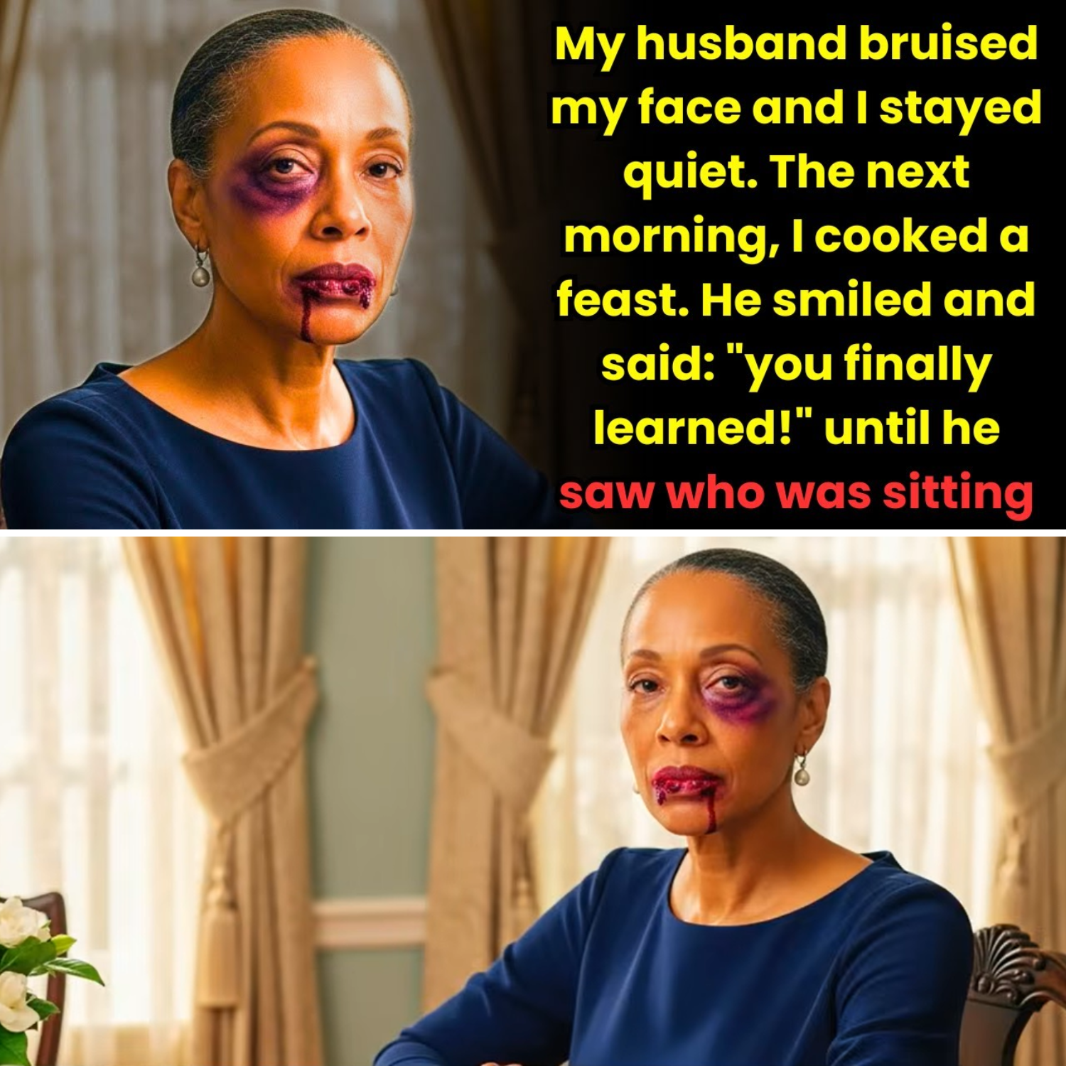 I sat at the head of the table, my back straight, my hands folded in my lap, wearing the navy dress I had worn to my mother’s funeral three years ago. I looked at myself in the hall mirror before I sat down, and I barely recognized the woman staring back at me. The bruise on my cheek was dark purple now, spreading from my cheekbone down to my jaw. My lip was swollen, split right down the middle where it had caught on my tooth when his hand connected.
