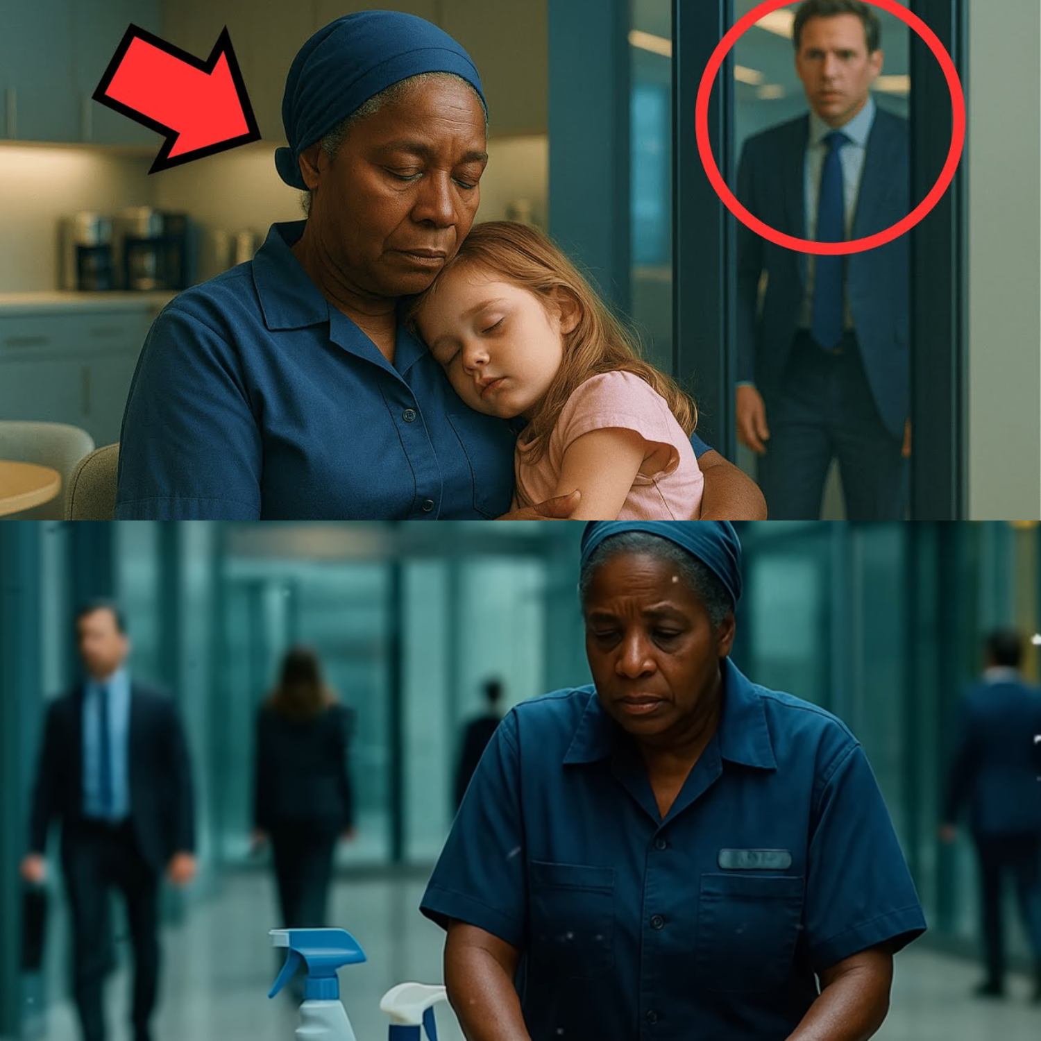 Ruth had worked there for seven months. A janitor contracted through an outside company. She arrived before 6 a.m. daily, dressed in a navy blue uniform with a worn-out badge, tall hands, quiet eyes, and a presence that seemed to blend into the walls. She spoke only when necessary, cleaned slowly, observed everything. She watched Lily often, sitting in the executive corridor alone, staring at nothing. Ruth never said a word, but she knew that kind of grief.