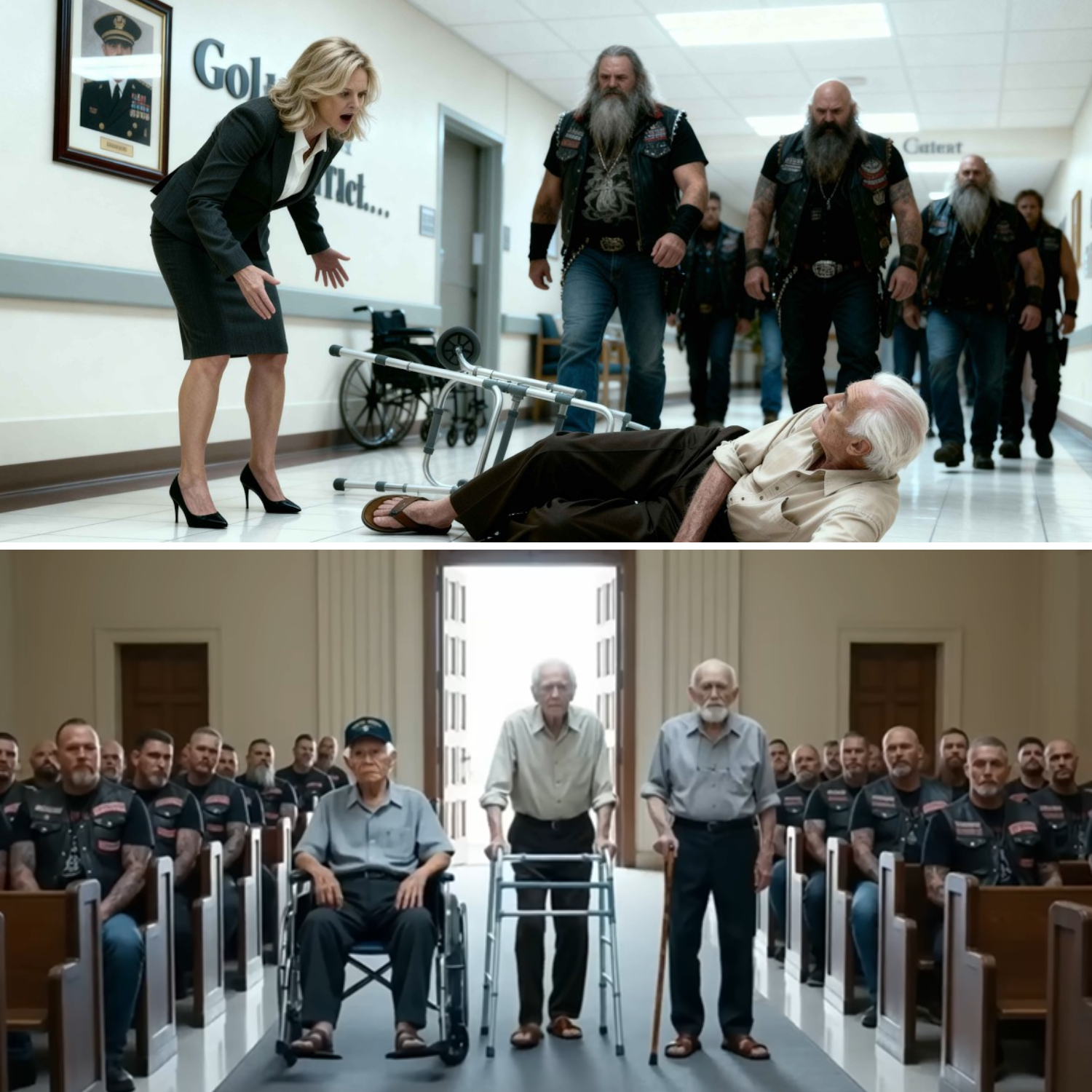 There are stories that begin with a slap and end with a revolution. At Golden Sunset Care Center, the slap echoed down the sterile hallway like a gunshot—a line crossed, a warning ignored. Patricia Hoffman, the director, had spent months starving World War II veterans, stealing their food, their medication, their dignity. But on this day, she picked the wrong target, and the wrong audience. The man she slapped was Walter Miller, a 94-year-old Marine whose spirit was forged at Normandy and whose resolve had never faded. And watching, just steps away, were 15 members of the Hell’s Angels, visiting another veteran. The world was about to learn what happens when you abuse heroes in front of warriors.
