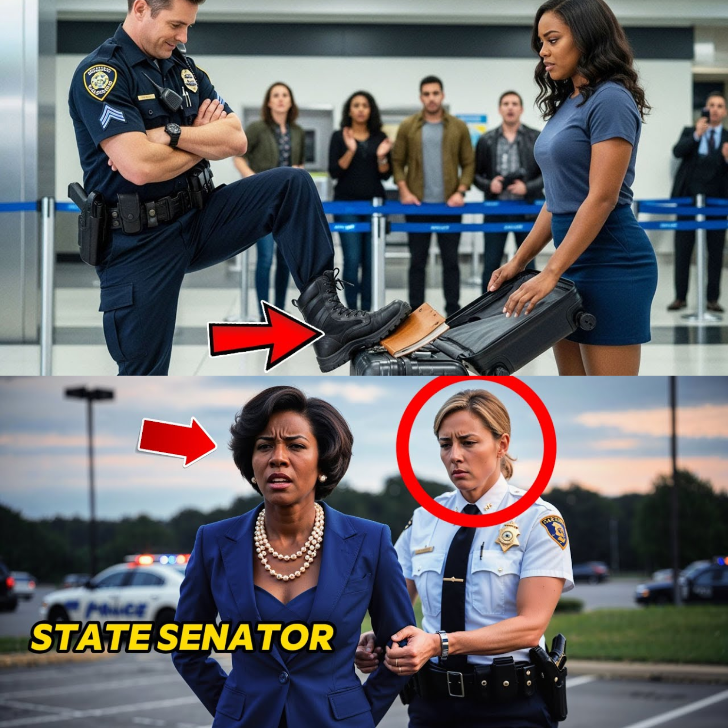 She knelt quietly, unzipping the suitcase to reveal not clothes, but thick legal binders and a single faded leather-bound notebook. Officer Stone immediately ripped out a binder, letting its contents spill onto the clean airport floor. “What is this? Budget proposals? Counterterrorism strategy? Trying to be a hot shot lawyer?” Leila didn’t respond, her silence only fueling his aggression. Her eyes locked onto the notebook—a gift from her late grandfather, filled with handwritten notes on civil rights law. It was her most cherished possession, the core of her career. Rick saw her focus and a cruel smirk spread across his face. He deliberately placed his boot on the open suitcase, pinning down the precious notebook. Then, in a moment of sheer racist contempt, he stomped the heel of his heavy tactical boot down hard on the luggage, crushing the corner of the leather notebook. Leila gasped, the force of the kick a clear message of humiliation.