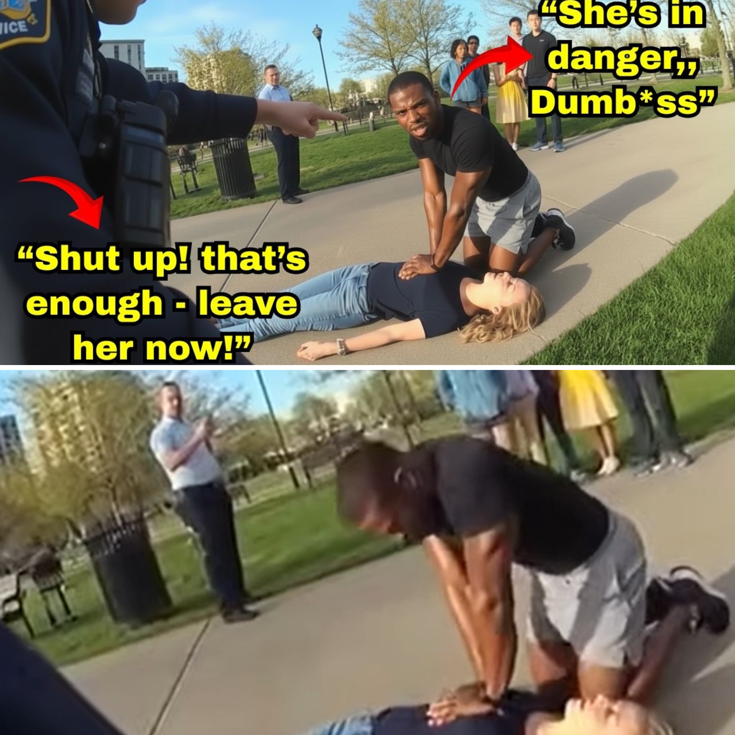 Handcuffs snapped tight around the wrists of the man who, moments earlier, had been the only barrier between life and death for the unconscious woman lying feet away — now without compressions.