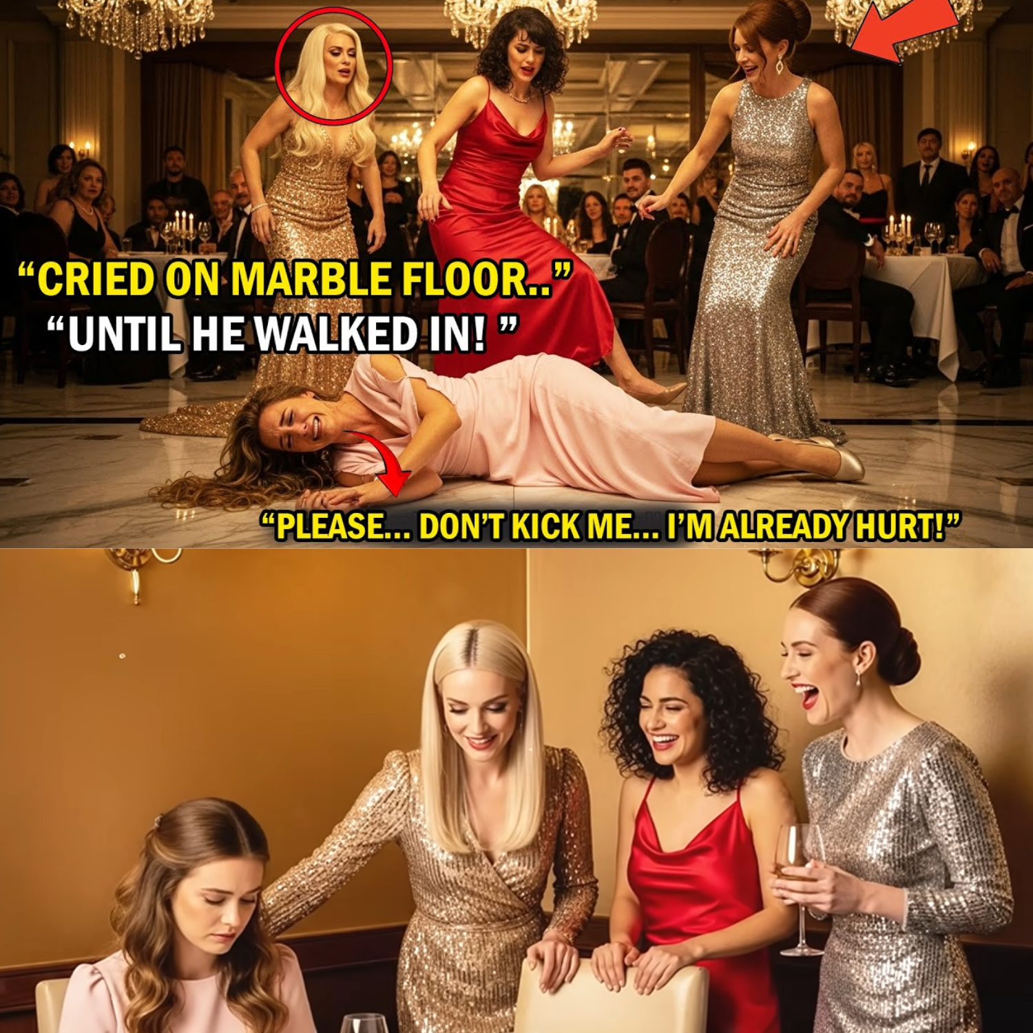 Please, don’t kick me. I’m already hurt. Those words, whispered from the cold marble floor, cut through the laughter of the rich like a knife. My dress hung torn from my shoulder, my dignity scattered like shattered glass. All I could do was clutch the fabric to my chest and beg for mercy. That was the moment the doors opened, and everything changed.