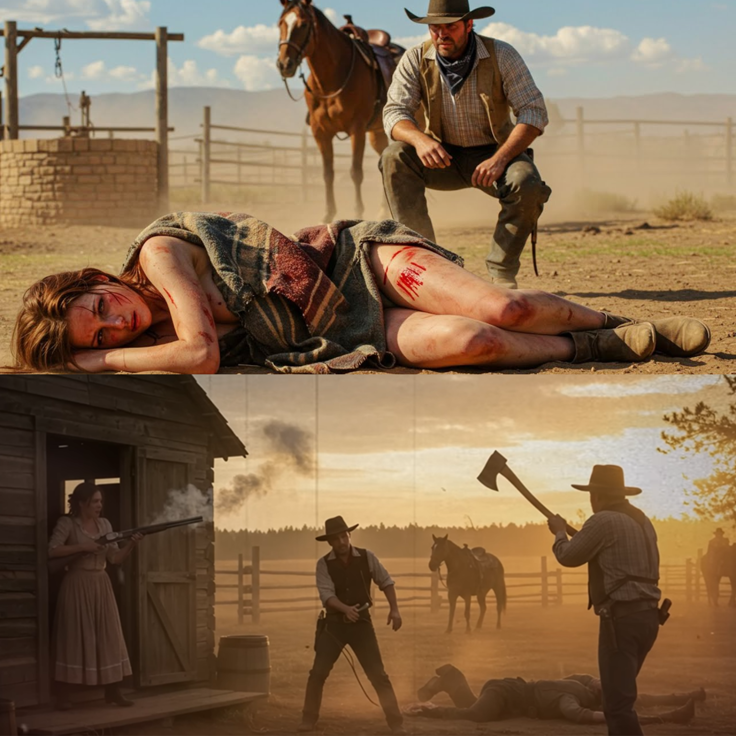 Inside, she heard them too—the boots on the porch, floorboards creaking, the door knob turning. She didn’t scream or hide. Instead, she grabbed the old shotgun Thomas kept by the window. He had shown her how to hold it, brace for recoil. The moment came—the door opened, a man stepped inside, cocky and sure. She pulled the trigger. The blast shook the room, dropping him like a sack of wheat. Outside, the other two froze. That’s when Thomas moved. Swinging his axe into the gut of the second man before he even left his horse. The third tried to run but didn’t get far—a bullet from Thomas’s sidearm caught him in the leg. When the dust settled, one was dead, one unconscious, one screaming like a trapped coyote. Thomas tied them up, dragged them behind the cabin, and rode to town by morning. The sheriff took the bodies with no questions, just a nod. Days later, posters came down at the general store—three names, three faces, all marked “captured.”