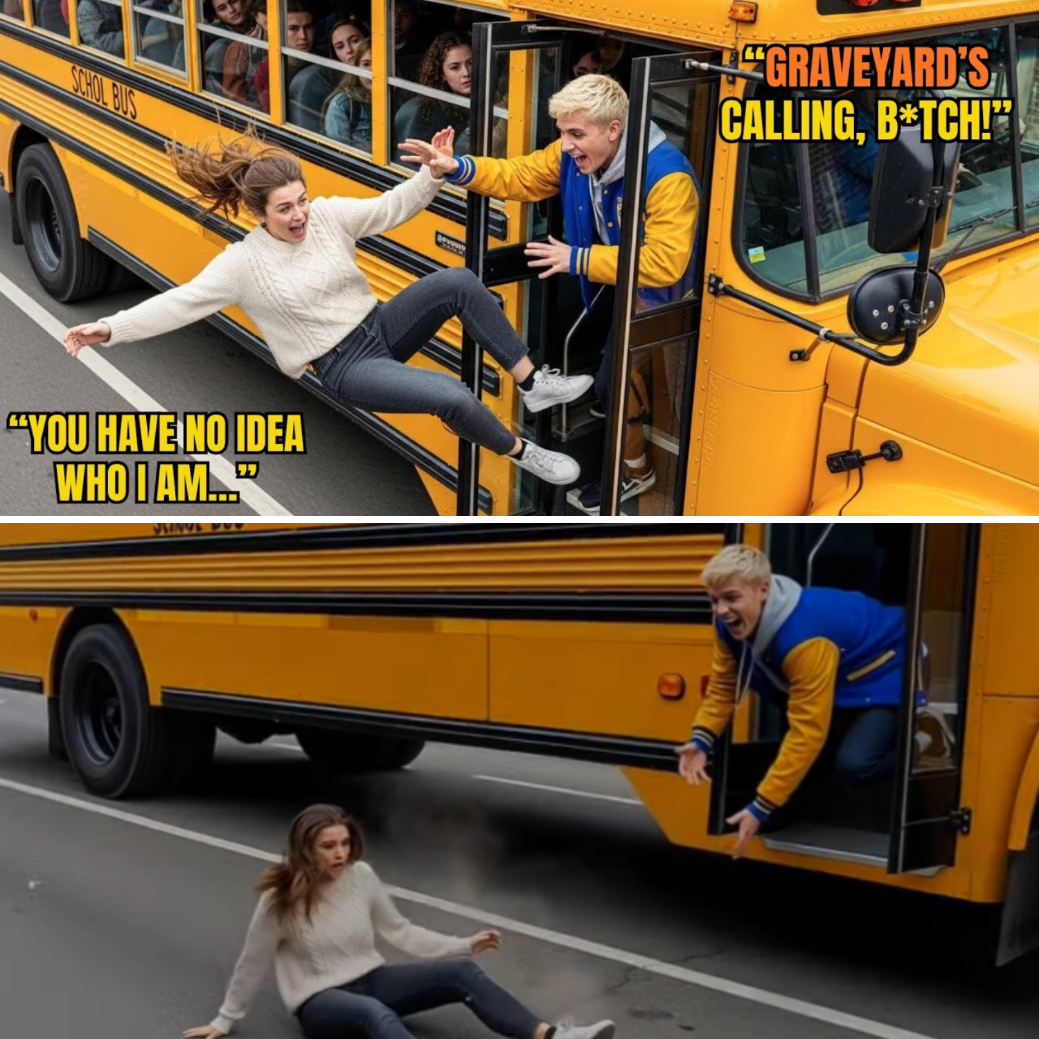 My heart hammered. I wanted to disappear, to melt into the seat. I stood up, not to confront him, but to try and deescalate. “Aaron, wait,” I began, voice trembling. My speaking, my use of his name, seemed to be the final trigger. In that chaotic moment, he didn’t see Katie Heron, the quiet new girl. He saw an extension of Janice’s rebellion. As the bus slowed for the stop at school, the doors hissed open. Aaron’s eyes, blazing with fury, locked onto mine. “You want off this bus so bad?” he growled. “Get off.” And then it happened—so fast, yet an eternity. His hands, strong from football, shot out. No gentleness, no hesitation. A brutal shove, fueled by frustration and a perceived threat to his authority. I was light, unprepared. The force lifted me off my feet. For a horrifying second, I was airborne. The world tilted. The shocked gasps, Janice’s scream, Damian’s cry—they all merged into a deafening roar. Then the asphalt met me. Jarring, bone-rattling impact. I skidded, tearing through my jeans, shredding the skin on my hands and knees. The bus, its mission accomplished, pulled away, leaving me in a cloud of exhaust and utter humiliation.