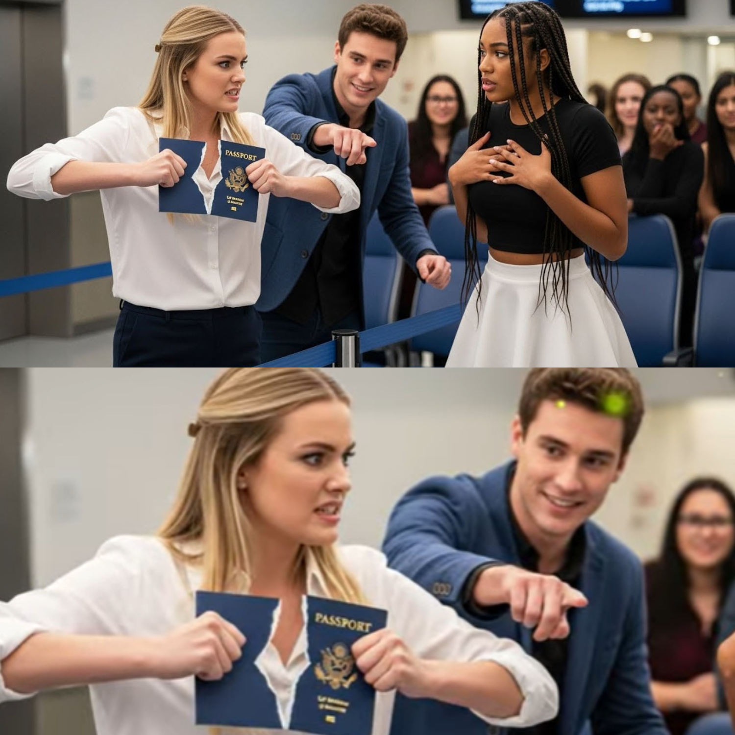 Khloe wasn’t done. She dangled the shredded passport like a trophy, parading her cruelty for the crowd. “First class isn’t for people like her,” she said loudly, gesturing toward Aaliyah. “Let’s be honest—she’s probably never even left her block.”