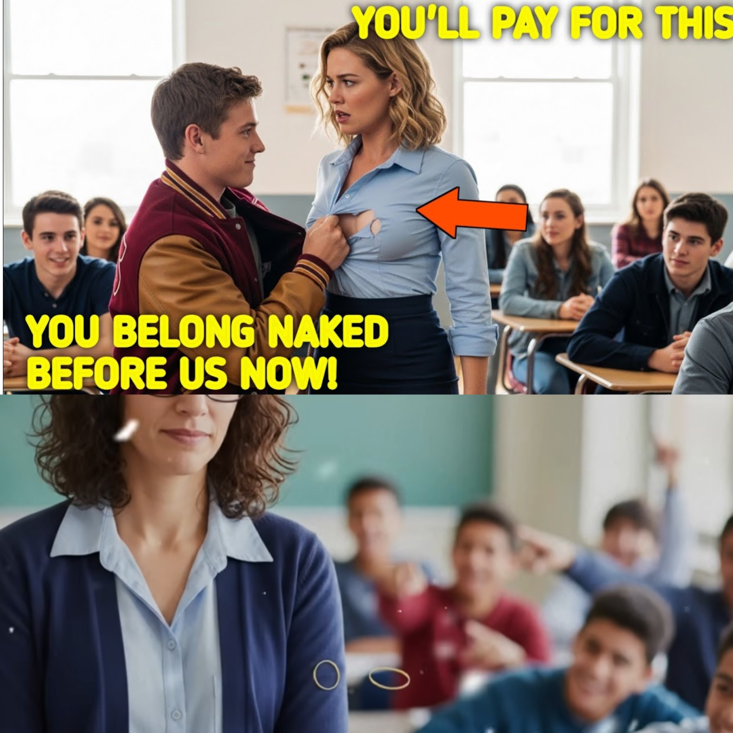 During roll call, Derek whispered to his friends, “Watch this. Let’s see how long before she quits like the last one.” He stood up, pretending to answer her, then tugged at the sleeve of her blouse as she passed his desk. The seam ripped cleanly, the sound so loud it echoed through the stunned classroom. Alina froze, clutching her shirt to her chest, eyes wide with humiliation. This time, no one laughed. Even the bullies hadn’t expected it to go that far. “Miss Reyes, I—” Derek began, but she didn’t speak. She just walked out of the classroom, silent.