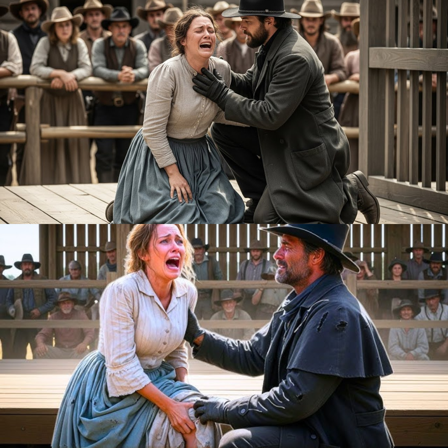 From the shadows, a voice came low and steady. “Three.” Heads turned. A tall man stepped forward, dust on his long coat, hat pulled low. He wasn’t smiling. He didn’t look at her like the others did. He walked to the platform, dropped three coins into the auctioneer’s palm, and said, “I claim nothing.” The auctioneer froze, the crowd murmured. Then the cowboy—Cole Jared—stepped to the edge of the platform and did something nobody expected: he dropped to one knee in the dirt before her. The whole barn went quiet. Even the horses stopped shifting. Allora’s breath caught. Cole reached down, untied the cracked leather straps of her boots, and set them beside her. His hands were steady, his touch gentle. “You don’t belong to them,” he said quietly, “and you don’t belong to me. I just bought your silence from monsters.”