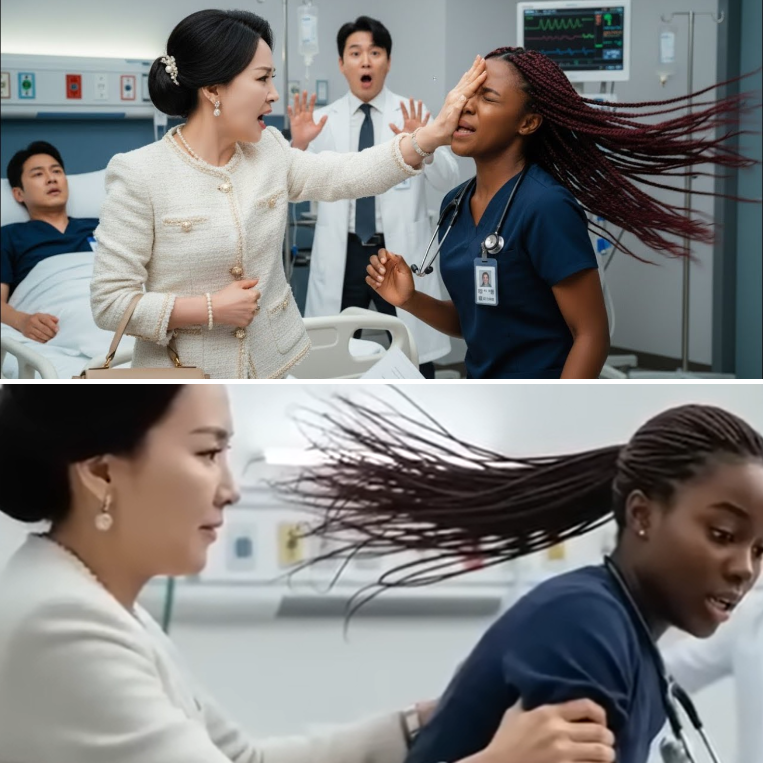 Standing over her was Mrs. Park Sun-hee, draped in Chanel, her chest heaving with rage, manicured hand still raised. She was screaming in broken English and rapid Korean about “people like you” and “keeping filthy hands off my son.” What Mrs. Park did not know—what would soon destroy her entire world—was that the black nurse bleeding on the hospital floor was engaged to Kang Ji-hune, one of Seoul’s most feared underground power brokers.