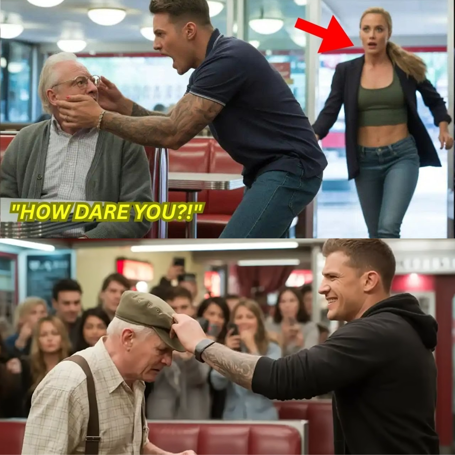 It was supposed to be just another quiet evening at Miller’s Diner, a cozy little spot where locals gathered for coffee and pie. But then, smack—the sharp sound of a slap echoed through the room, slicing through the ambient chatter like a knife. An elderly man, silver-haired and bent with age, wearing a cap embroidered with faded military insignia, had just been struck across the face by a cocky young man. “Shut up, old man!” the bully barked, his voice thick with arrogance and disdain. Laughter erupted from his friends seated nearby, while phones were whipped out to capture the humiliating moment.