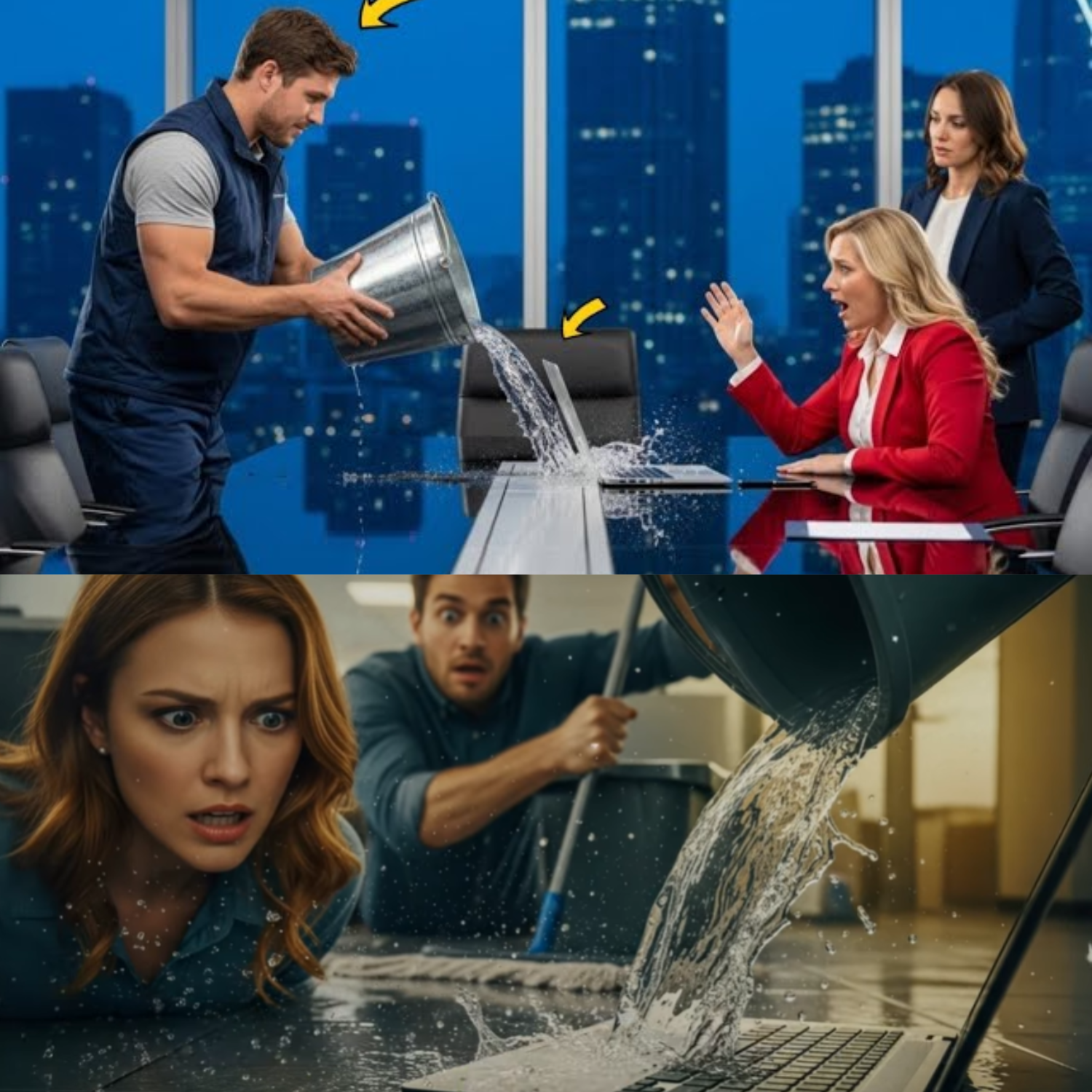 Tom stepped closer, hesitant. “My—my can get some towels,” he stammered. He hurried to his cart, grabbed a cloth, and in his rush, bumped the mop bucket beside him. Water splashed across the floor and straight onto the CEO’s laptop. The room froze. Rachel’s face turned white. “What did you just do?”