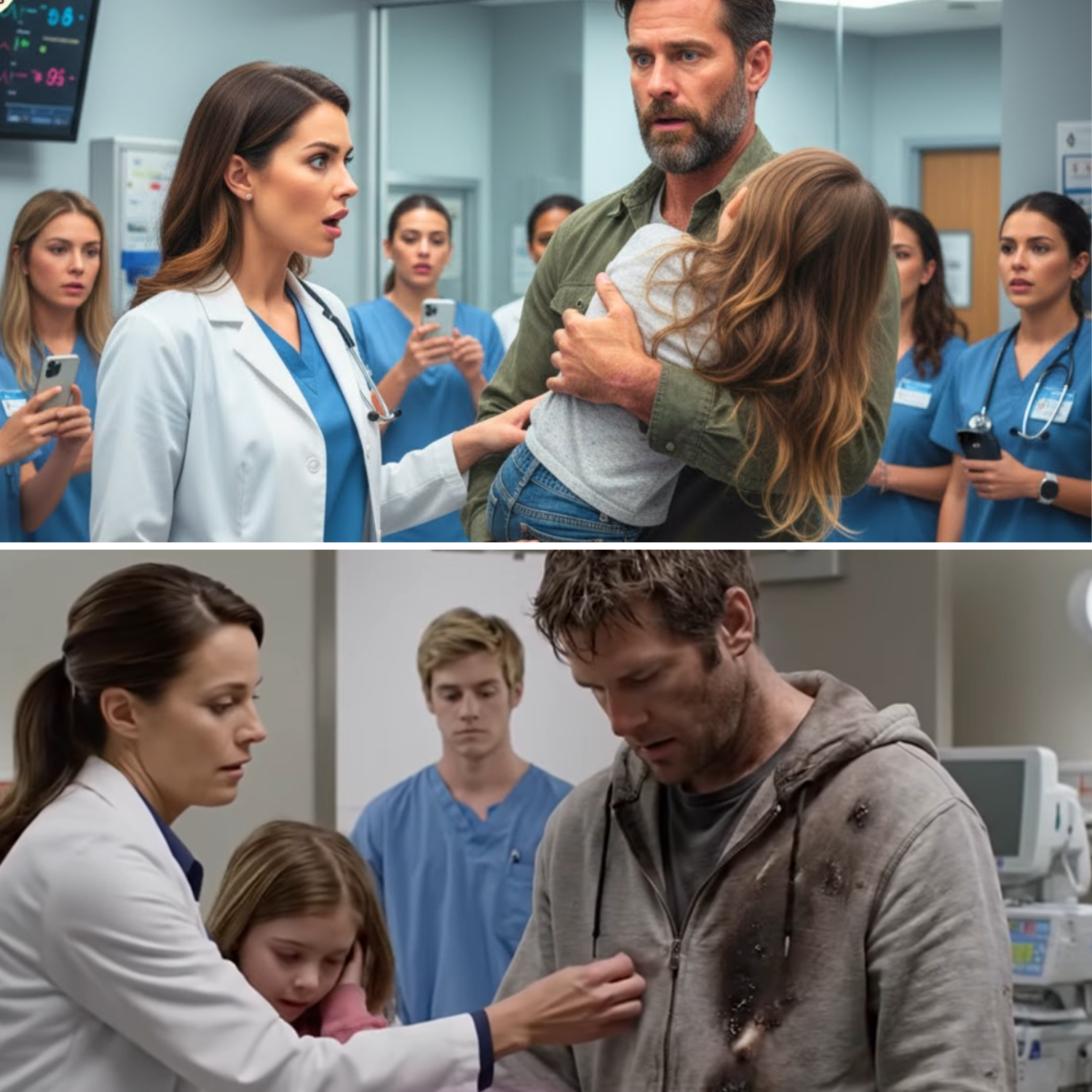Evan Miller crashed through the emergency room doors as if the world was burning behind him. His denim jacket was torn at the elbows, faded cargo pants hung loose, and his battered shoes looked ready to fall apart. He carried Lily, his six-year-old daughter, pale-faced and gasping for every breath, straight to the triage desk. Evan’s own breathing was ragged—not from running, but from the bone-deep terror only a parent knows. He ignored every stare, every whisper, every sideways glance. But the stares were there anyway. The waiting room was packed and every head turned—not out of concern for Lily, but because Evan’s rough appearance hit their eyes like a warning. A woman clutched her purse tighter. College kids snickered, their glances edged with disdain. Another father gently pulled his son away, as if Evan was some lurking threat. In America, a scruffy man in ragged clothes carrying a sick child is more likely to trigger suspicion than compassion.