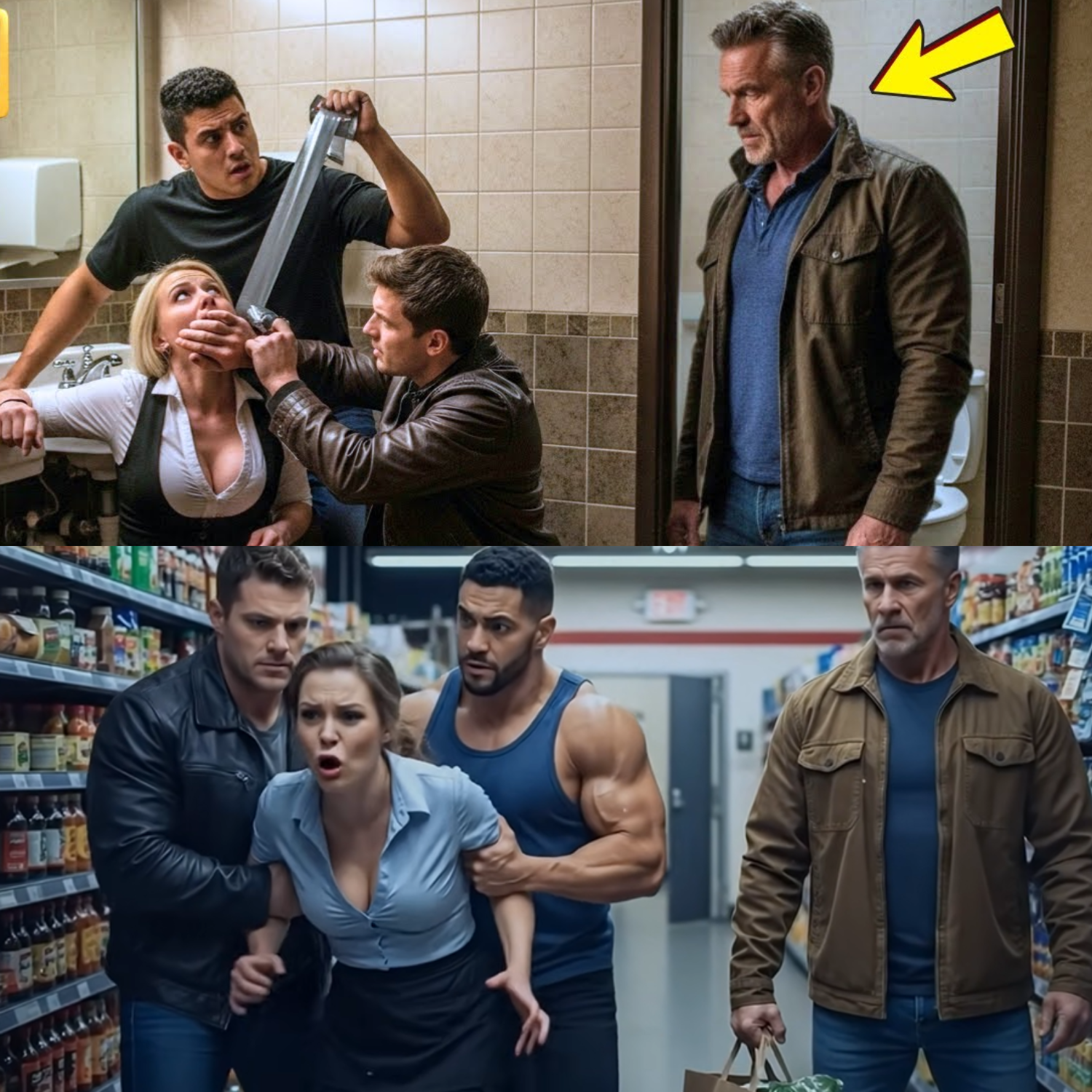 The restroom door was heavy, commercial grade. Dennis eased it open in silence. Small space—three stalls, two sinks, hand dryer. The woman was on the floor, leather jacket kneeling on her back, hand over her mouth. The second man pulled duct tape from his pocket. They didn’t hear Dennis enter. Classic mistake—never assume you’re the apex predator.