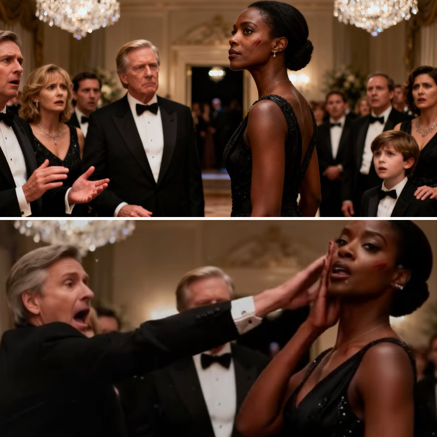 It started with venom disguised as champagne. Mrs. Eleanor Rothell, matriarch of Manhattan’s most powerful family, cracked her manicured hand across Maya’s face. “Get this welfare trash out of here before she steals something,” she spat, Cartier bracelet flashing like a warning. James Jr. yanked Maya’s scarf, sending her reeling into the dessert table. Chocolate mousse splattered, caviar hit marble, and Victoria Sterling kicked Maya’s purse, spilling its contents. “Look at that cheap knockoff bag,” she sneered, her phone already live-streaming humiliation to millions. Senator Charles Rothell pointed his cane at Maya’s chest, voice booming, “Security, remove this creature immediately.”