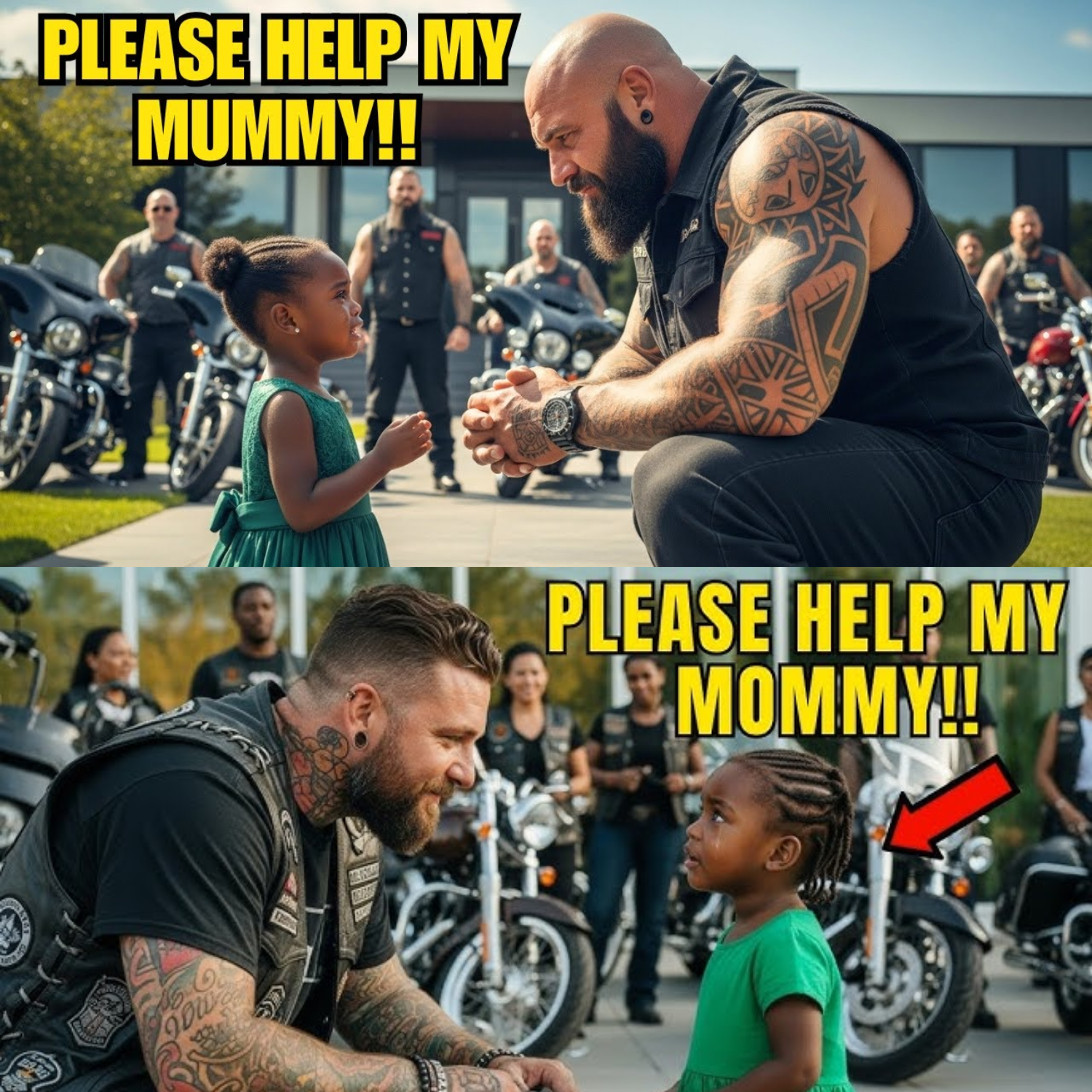 Please help my mommy. They’re hurting her. The desperate scream tore through the quiet of the urban avenue like thunder before a storm. Her small voice trembled with terror and heartbreak, echoing across the wide parking lot of a lavish glass high-rise. The little girl, Emily Thompson, only five years old, dressed in a neat blue dress now wrinkled and dusty, ran barefoot toward a group of riders parked across the road. Tears streaked her olive cheeks as she stumbled, clutching the hem of her dress, her sobs slicing through the calm evening air.
