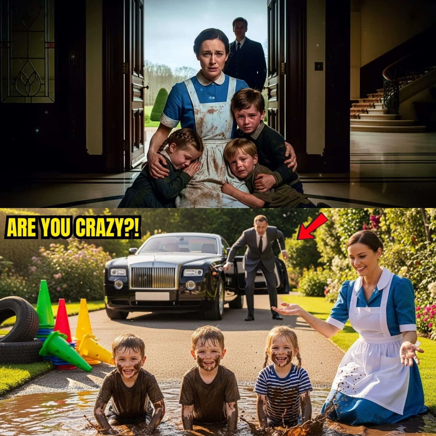 Not polite laughter from a reception, but full, round laughter, rich with air. He looked up, and the world shifted. Three children, covered in mud, were celebrating in a brown puddle, splashing the perfect lawn. Beside them, on her knees, the nanny in a blue uniform and white apron smiled as if witnessing a miracle. “My goodness,” he let slip, still inside the car. His heart raced, pulling up a memory he’d rather forget.
