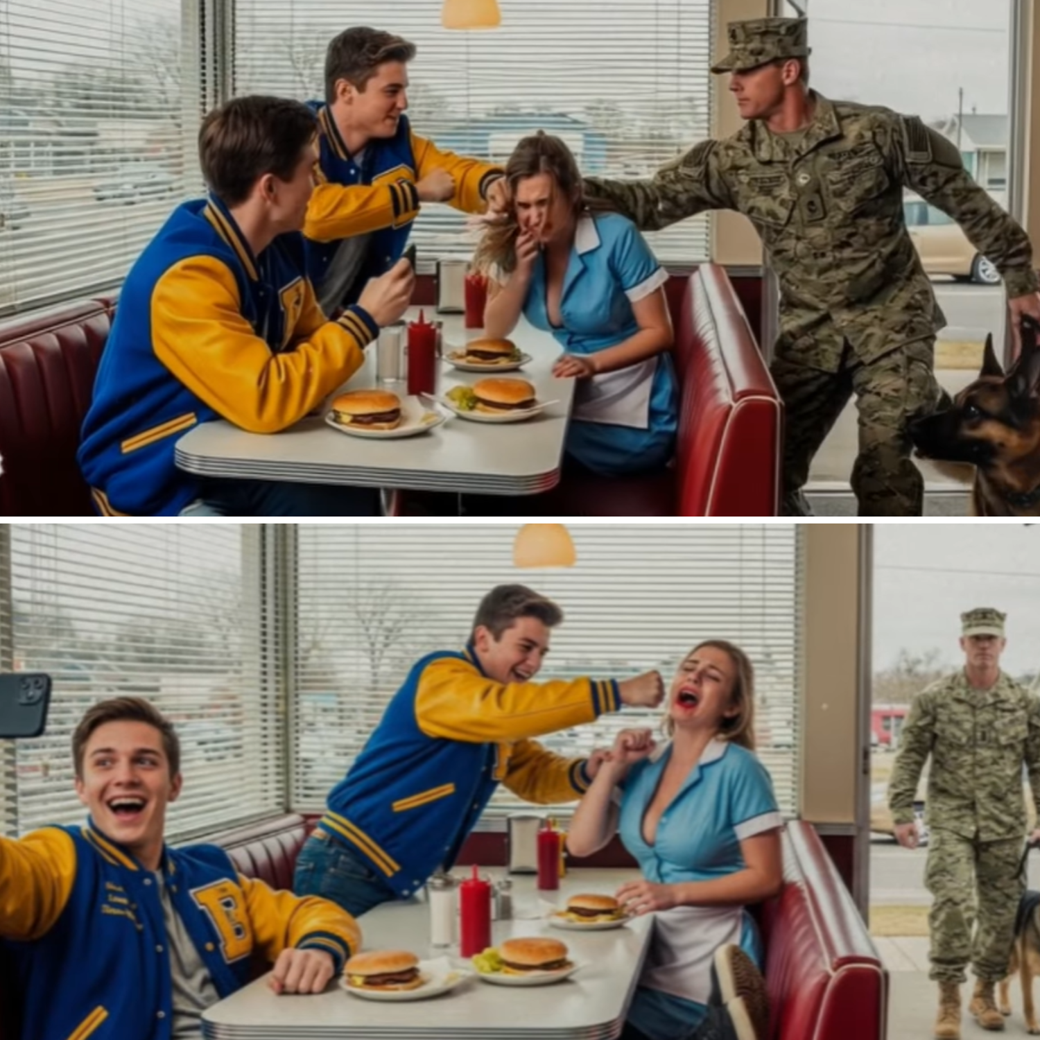 In the corner booth, away from the main flow, sat the storm. Jake and Leo, seniors from the local high school, their privilege and arrogance woven into every thread of their varsity jackets. Jake, larger and cruel, wore a smile that never reached his eyes. Leo, lean and sly, held his phone aloft, camera lens a cold, unblinking eye. They were recording. Everything was content.