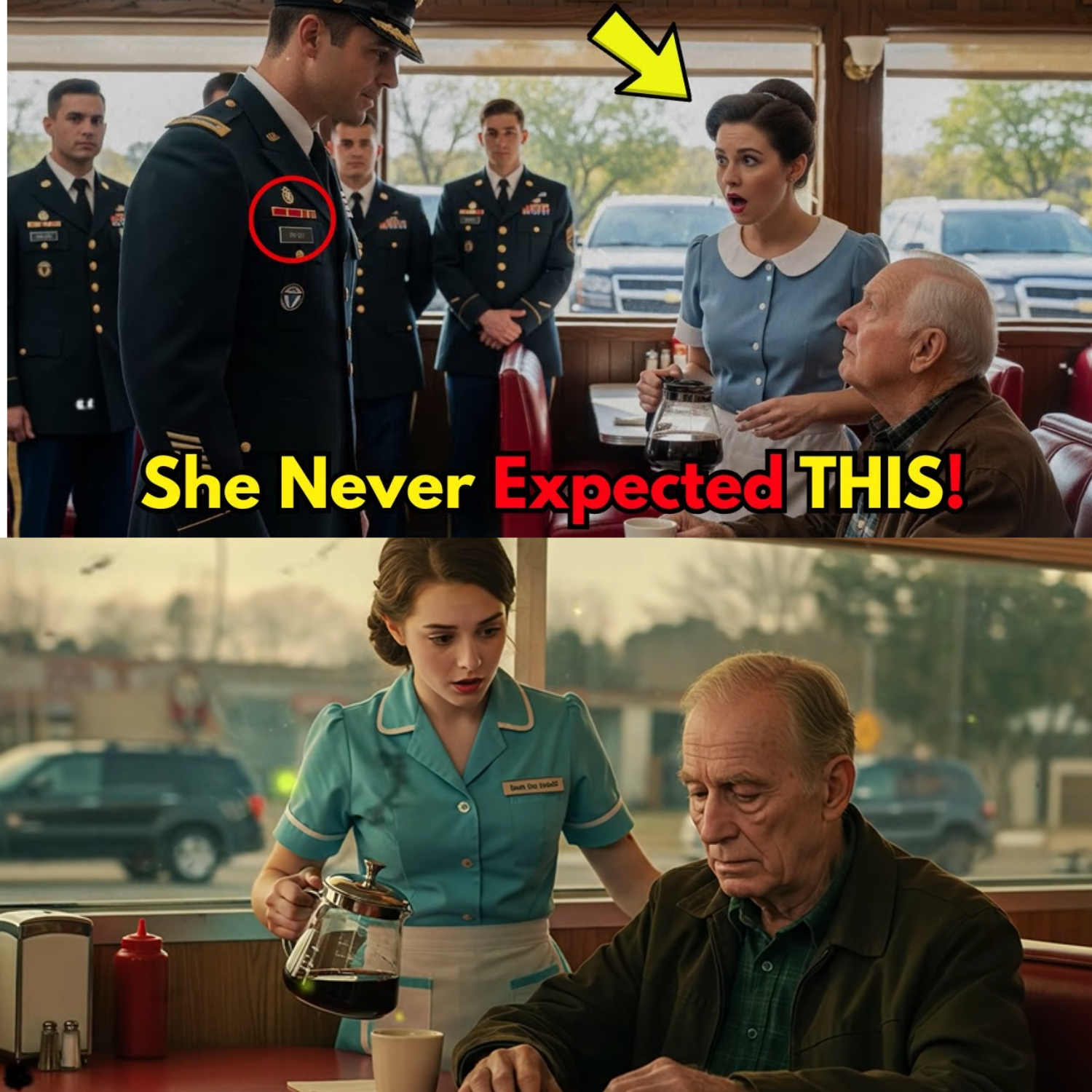 Tears welled in her eyes as the old man turned and placed a trembling hand on hers. For the first time, he smiled—not as a stranger, but as someone whose story had been seen, whose dignity had been preserved. The soldiers escorted him out, but one paused at the counter, looking at the waitress with a gratitude that words could never capture. “You saved him,” he said quietly. “You didn’t know who he was, but you saved him.”