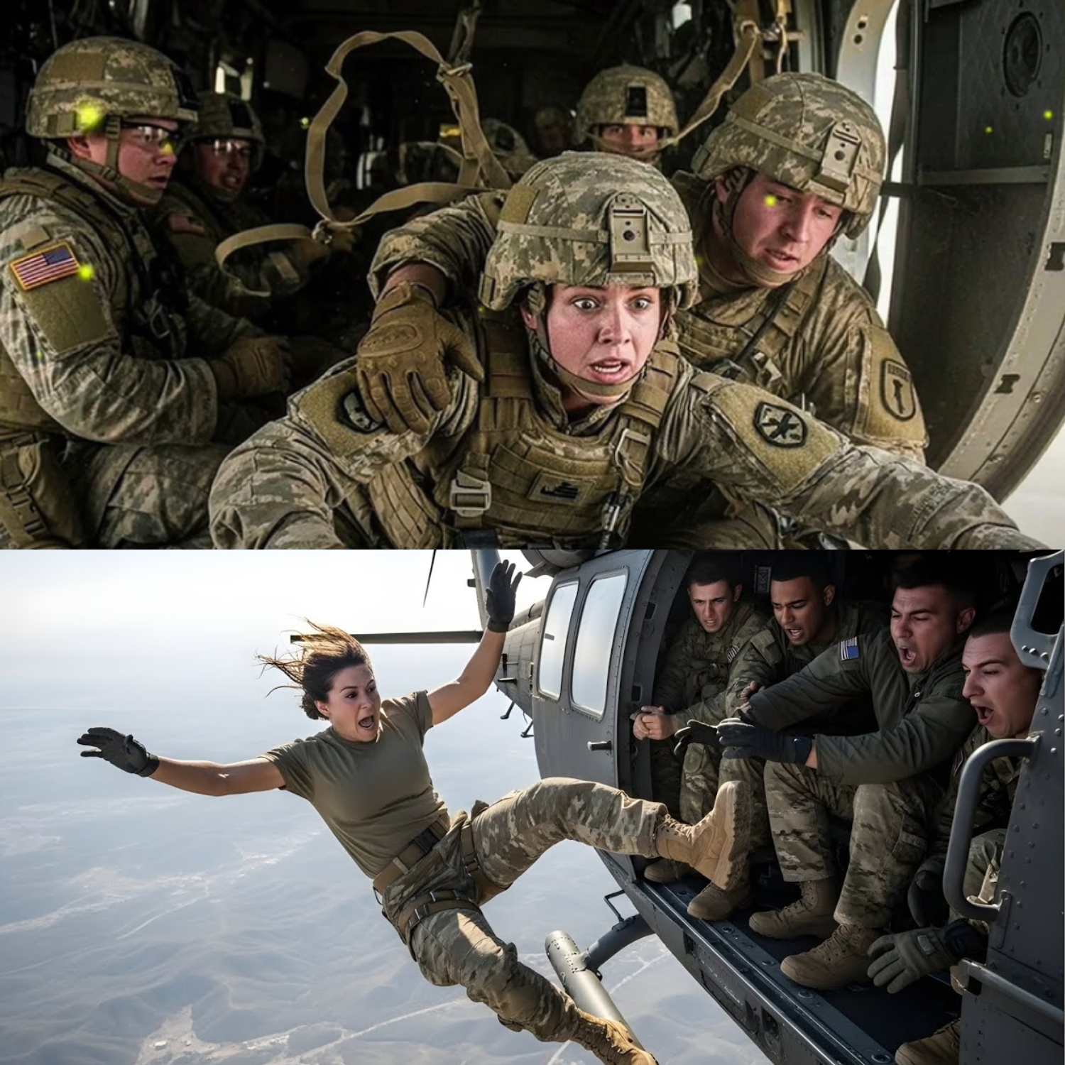 “Go! We can’t all die here!” he yelled. She screamed, “There’s no chute!” But his hands didn’t stop. In a split second, she was gone—thrown into the roaring blackness. The air ripped the breath from her lungs. The world became a blur of cold and fear. The helicopter lights vanished above her, replaced by the haunting silence of free fall. She was falling without a parachute from 2,000 feet.