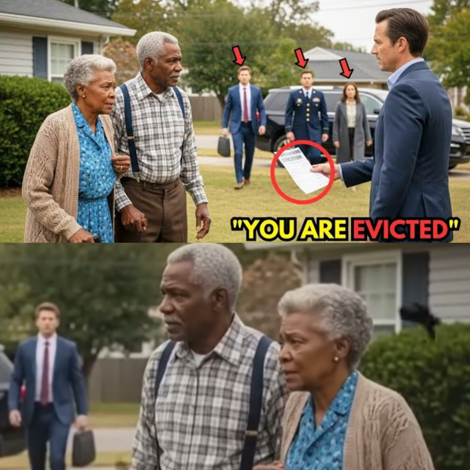 Time’s up. The landlord sneered, waving eviction papers like a weapon as movers climbed the slick porch steps. Rain slicked the pavement, and phones rose from every corner, capturing every moment. Eleanor clutched the brass key to her chest like a lifeline, her fingers trembling but determined. Walter braced himself with his cane, refusing to step aside. Then, a horn split the tense silence. A sleek black sedan screeched to a stop at the curb. Out stepped a woman in a sharp navy suit, documents flashing in her hand. Behind her, a military jeep rolled in, a uniformed figure stepping out with measured authority. Then came an SUV, cameras following close behind. The crowd gasped, whispers swirling like a storm. Who were they? And why did the landlord suddenly pale? The porch light flickered once as the children formed a protective wall around their parents. What happened next would turn the entire block upside down.