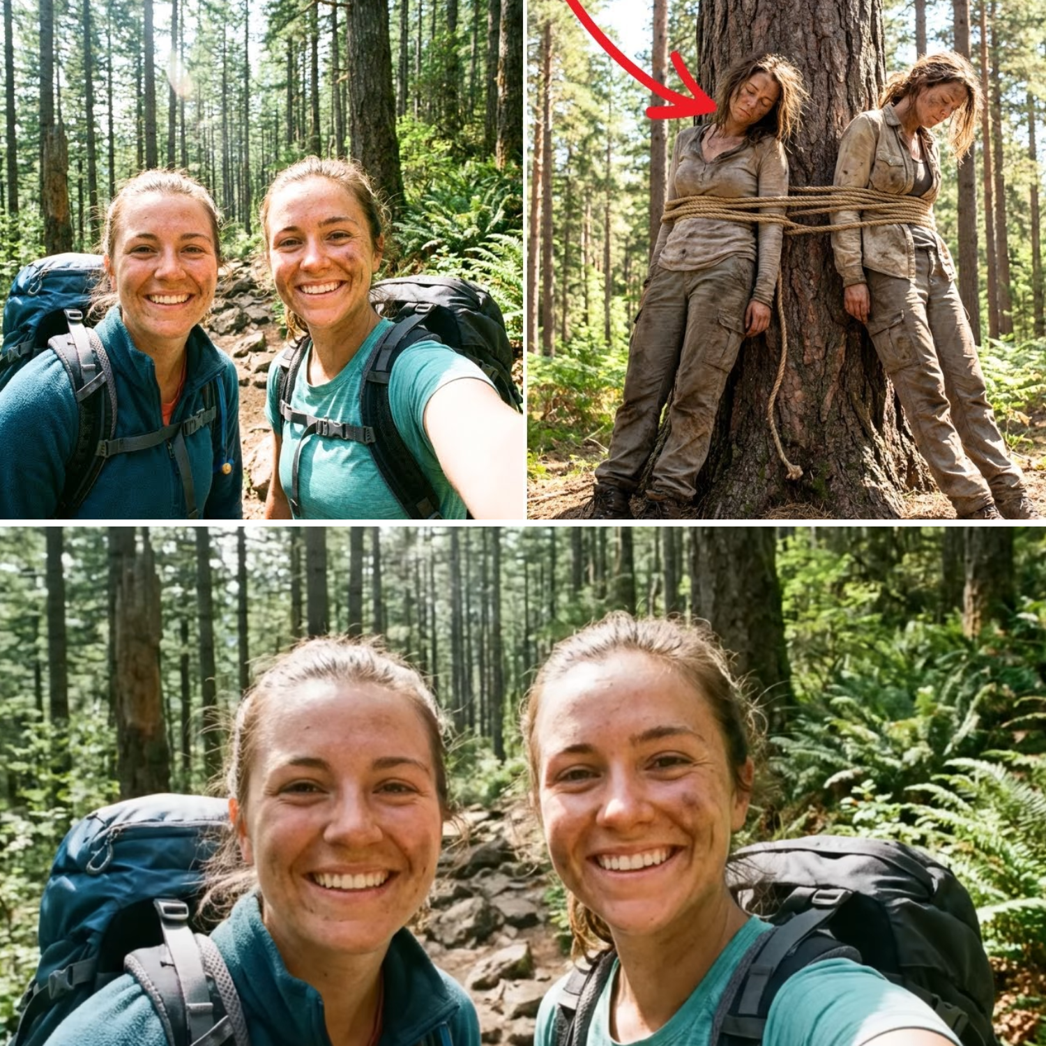 But on December 14th, a wildlife biologist named Gordon Pace stumbled upon a sight so surreal it seemed ripped from a horror movie. In a remote patch of old growth, four miles from the Lewis River Trail, he saw two figures bound upright against a massive Douglas fir. At first, he thought they were mannequins—an art prank or a twisted joke. But as he drew closer, the truth hit him like a punch: it was Nina and Rebecca, their bodies slack, their faces streaked with dirt, their hair matted, their skin pale and chapped from exposure. They were tied with thick nylon rope, arms pulled behind the trunk, legs bound at the knees and ankles, held upright by cruelty alone.