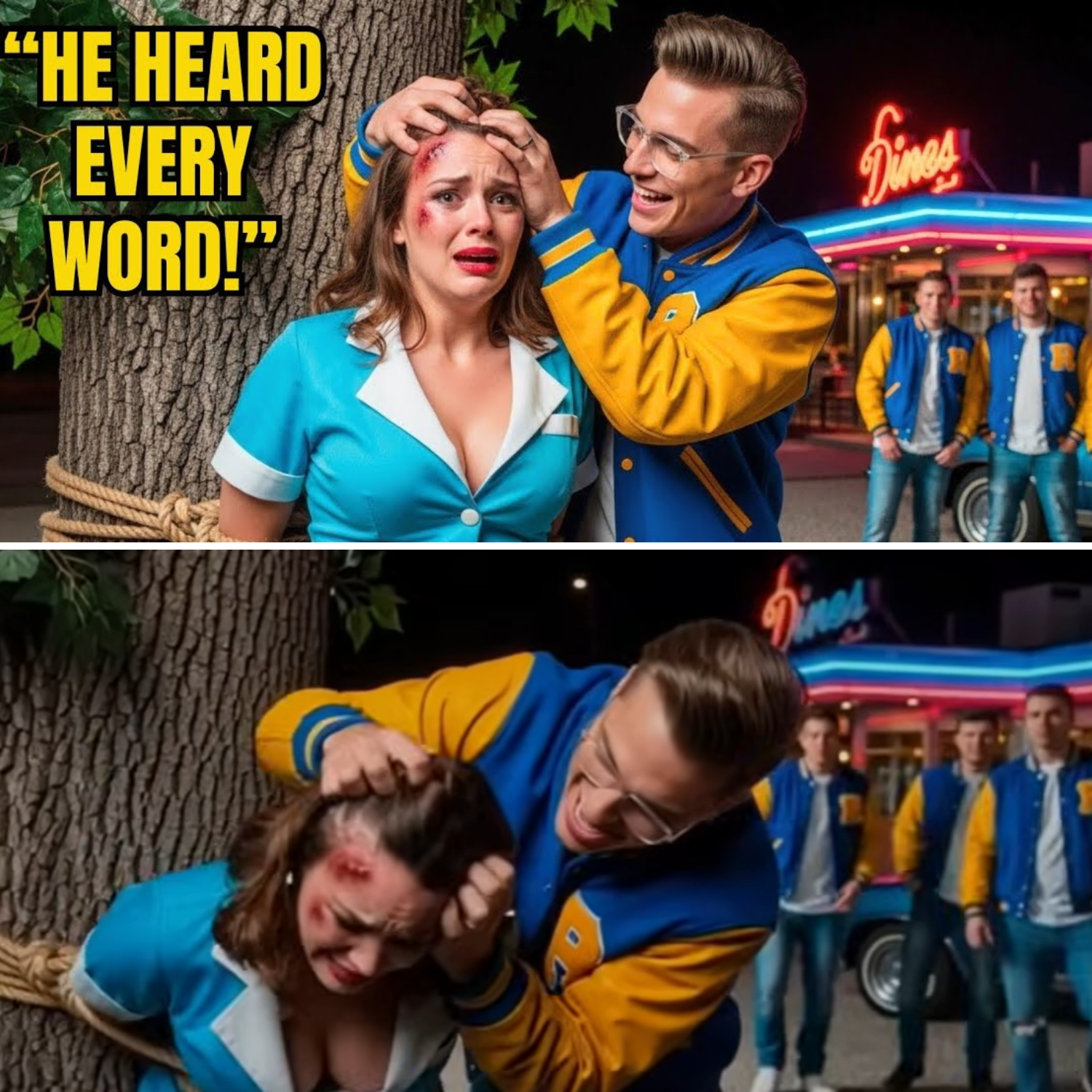 The rope burned against Sarah’s wrists—coarse, unforgiving, biting into her skin as the laughter of four young men shattered the cold night air. Under the neon pink glow of the Retro Mel’s Diner sign, Sarah, still in her sky-blue uniform, was tied to the old oak tree, her cheeks stinging from a fresh slap, tears carving clean lines through the dust on her face. Mark, the ringleader in his varsity jacket and clear glasses, leaned in, breath fogging in the air. “You should’ve just given us the free fries, sweetheart.”