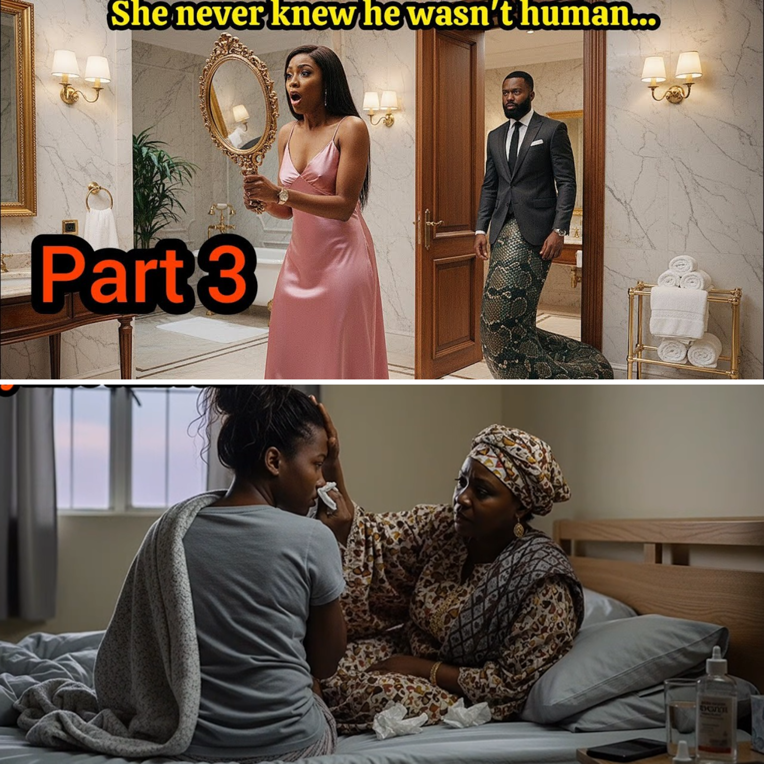 That night, sleep brought no peace—only horror. In her dream, Julia felt something moving on her bed. She opened her eyes to see a massive python lying beside her, its eyes glowing like lanterns, its body curling gently around her legs. Paralyzed by terror, she watched as the snake’s skin cracked and split, transforming into Doha. He knelt beside her, voice weak, begging her not to harm the pregnancy. Julia recoiled, shouting for him to stay away. Doha pleaded, promising to explain everything in time, but the dream shattered, leaving Julia gasping awake, drenched in sweat, heart pounding like a drum.