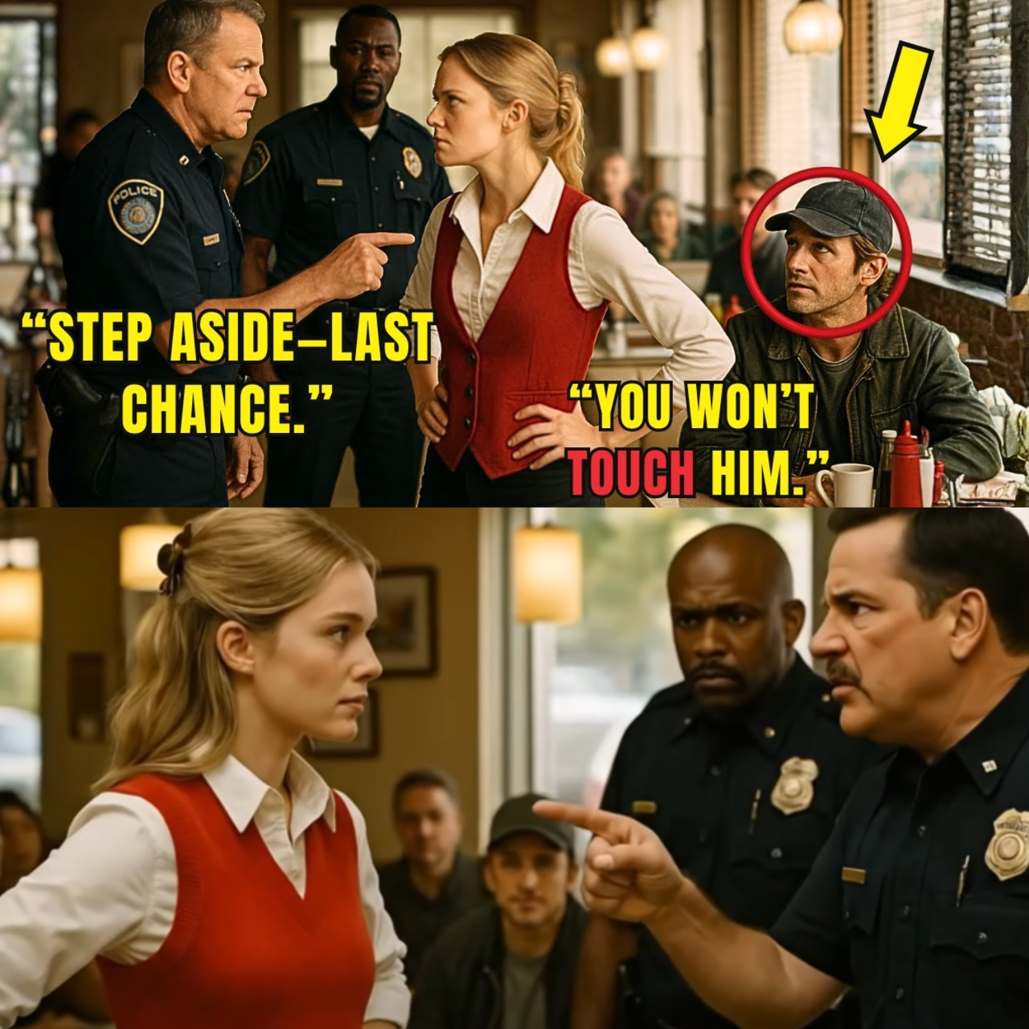 The next morning, the diner was packed. Locals and strangers alike wanted to meet the waitress who’d stood up to the cops. Sarah moved through the chaos, her smile brave. At the counter sat the man from the booth, his face hidden under a familiar cap. He looked up as she approached. “I owe you,” he said. “Name’s Jordan Hail. I’d like to talk.”